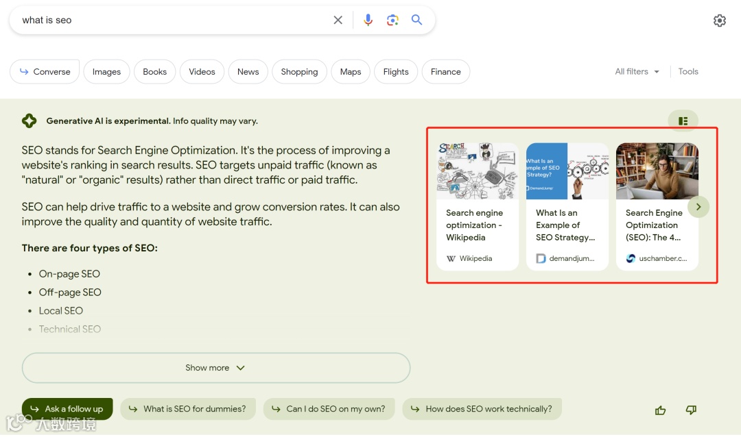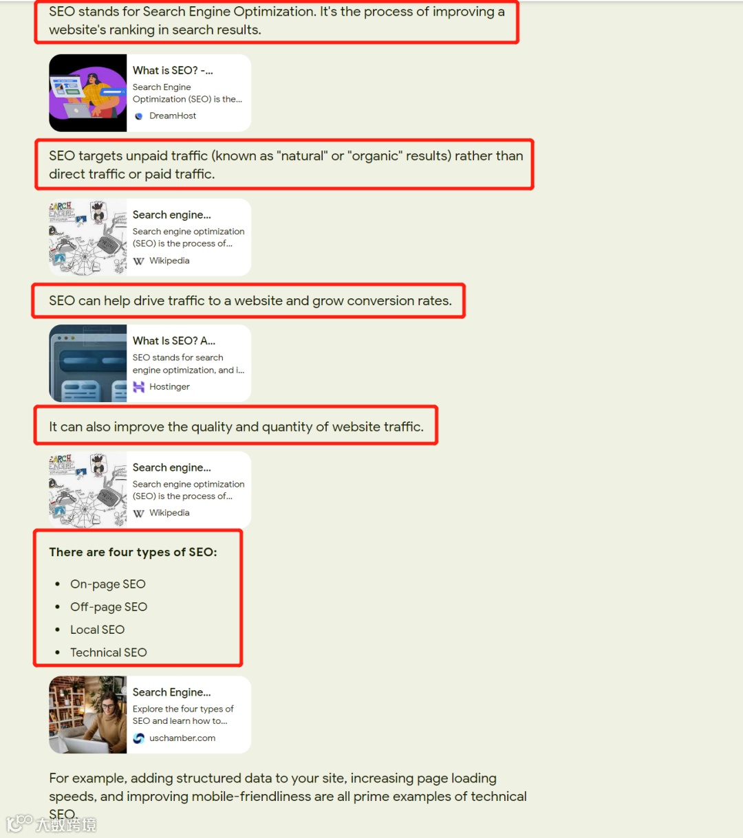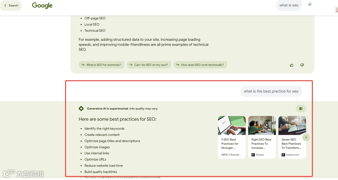 我们尝试搜索同一个关键词,例如 “What is SEO”,来测试Google SGE是否会为每次相同搜索生成差异性比较大的内容,以及在内容来源推荐上是否会有比较大的变化,结果发现并没有,我们猜测可能是因为 Google SGE 的算力成本要远大于普通的Google搜索,因此采用这种折衷的方式来在巨大的算力成本和良好的用户体验中找到一个平衡点。