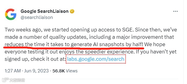 从测试体验来看,当前Google SGE的内容生成速度还是挺快的,可以媲美Chatbot(ChatGPT/Bard)的反应速度了,而且Google官方也表示近期有针对Google SGE的性能进行了提升优化