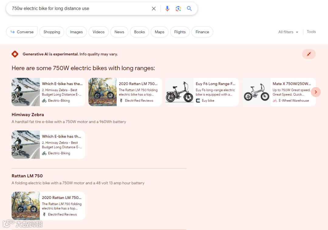 在之前的Google SGE介绍文章中,我们猜测它会对测评类内容造成严重的负面影响,因为在AI生成式内容中会直接展示产品的参数价格等信息,导致用户无需再进入测评类网站查看,但从当前的测试情况来看,也许影响并没有我们想像的那么大,例如当我们搜索关键词“750w electric bike for long distance use”时,AI生成式内容中的推荐来源站点会同时包含Ebike品牌站的产品详情页和第三方测试类内容页面。
