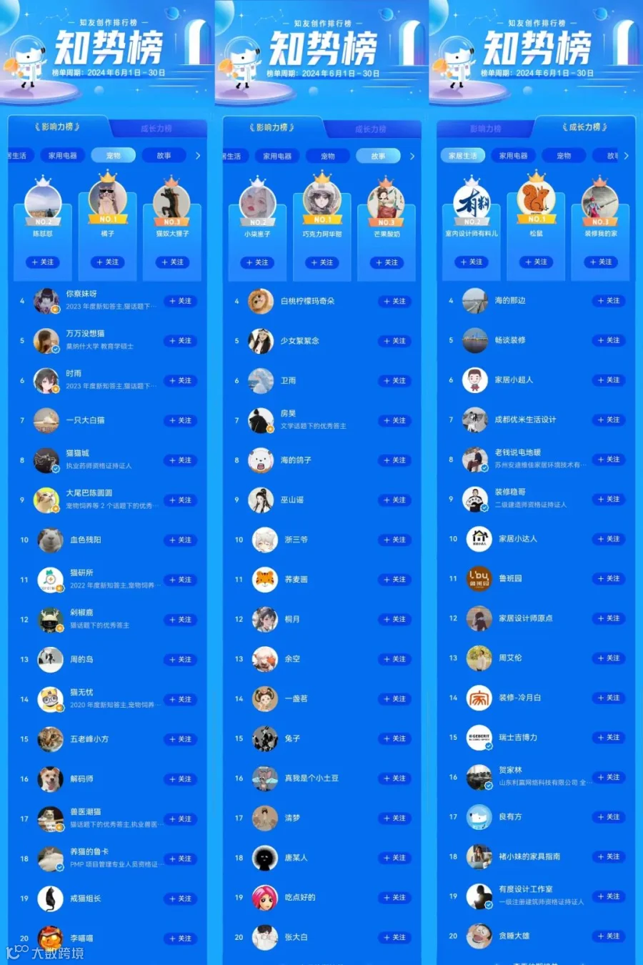 影响力榜-宠物、故事领域;成长力榜-家居生活领域