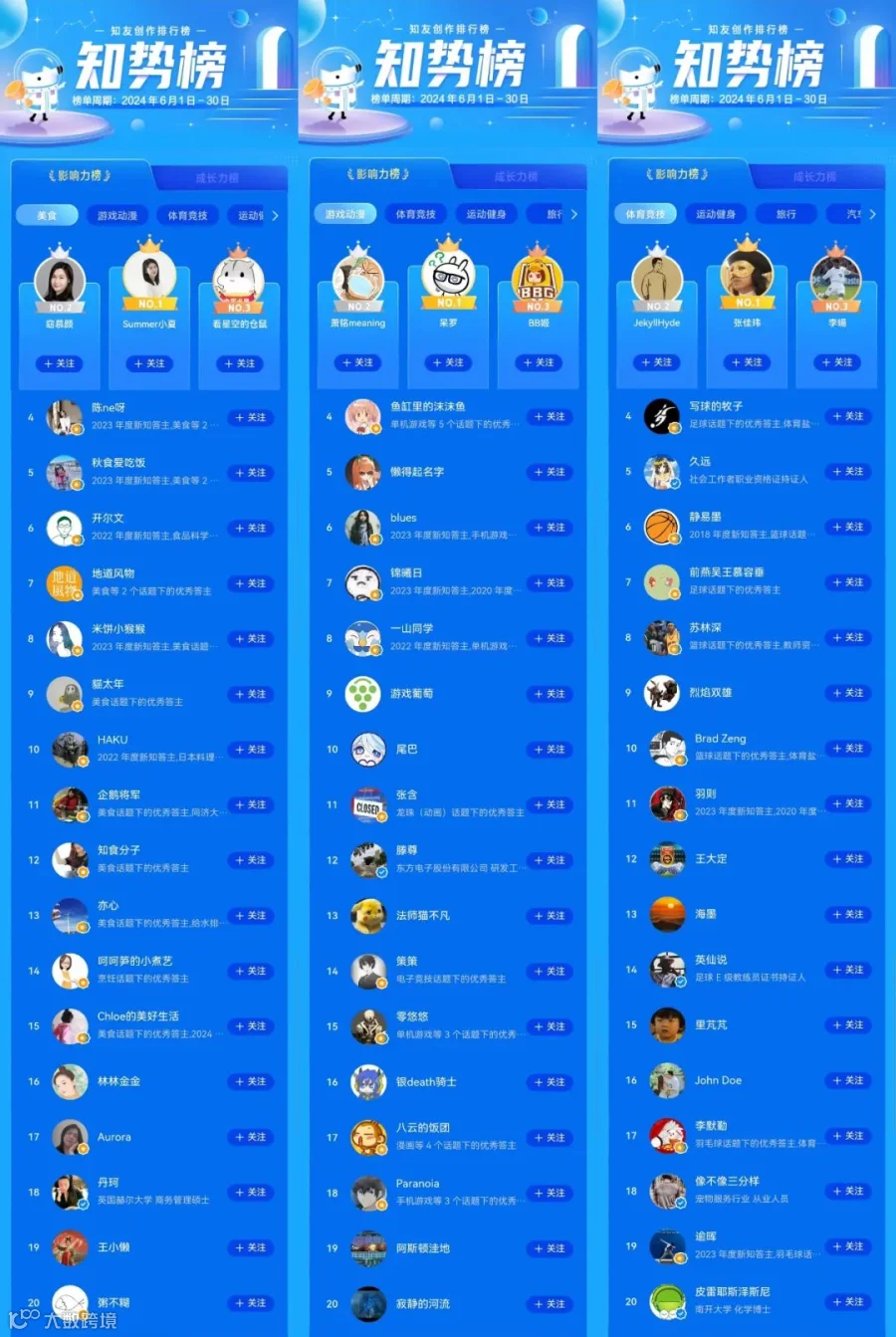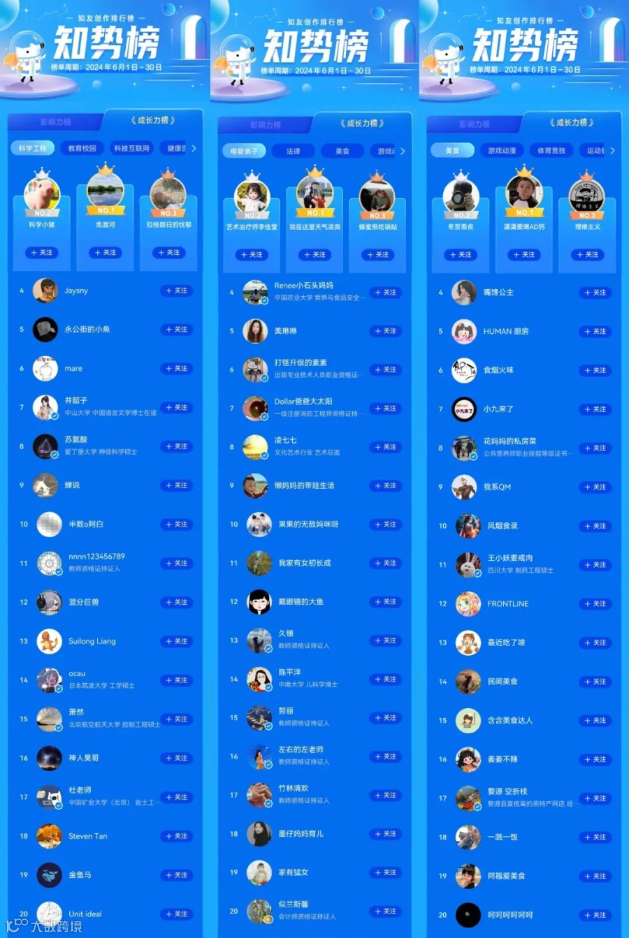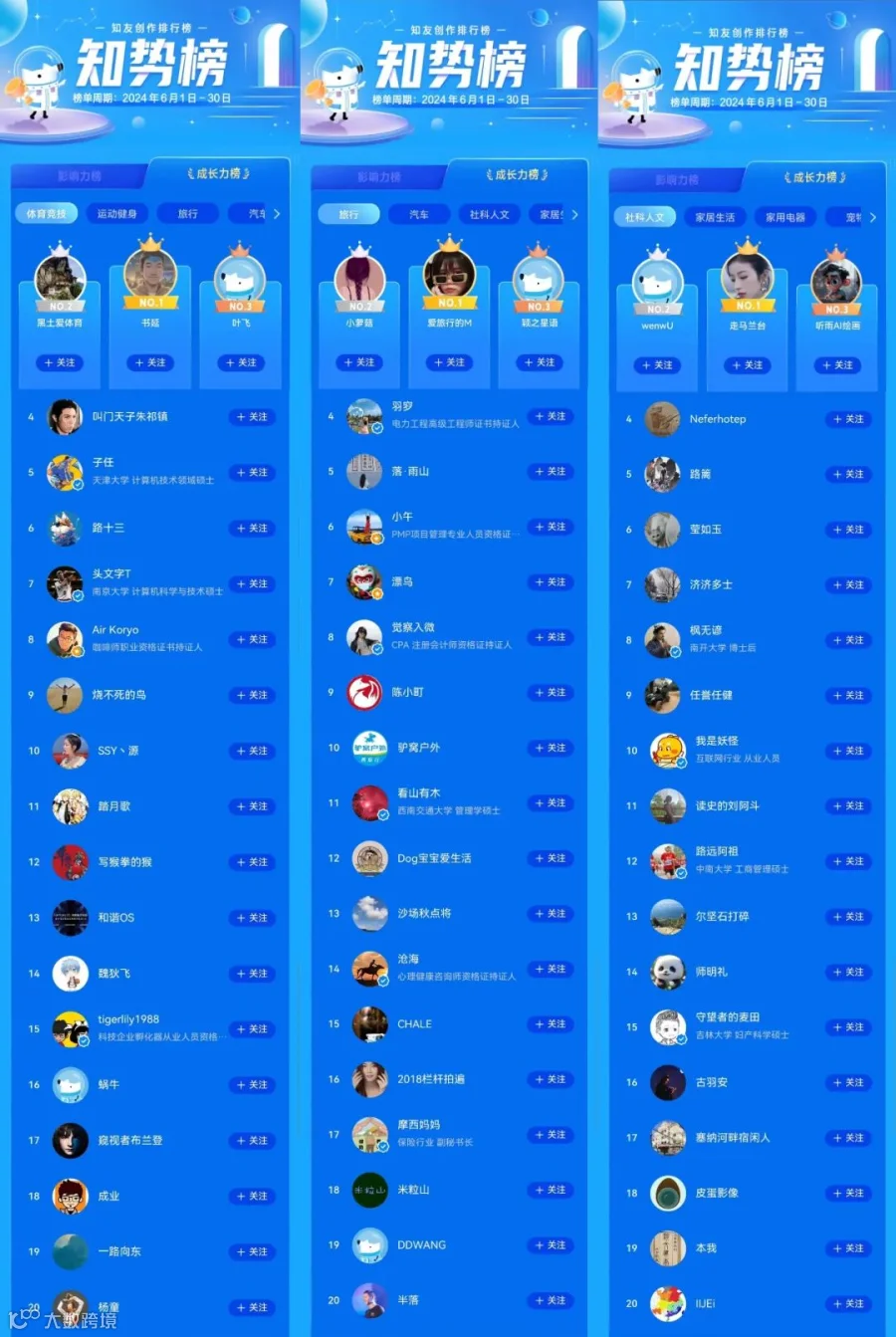 本期榜单统计周期为2024年6月1日至6月30日,全面展示各领域内容创作者的专业性与影响力,助力优质内容在平台内实现更广泛传播[k]。