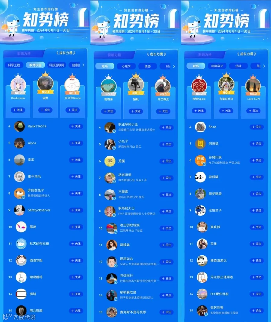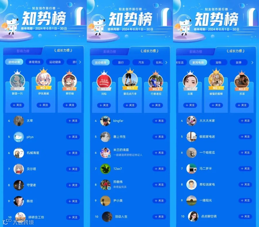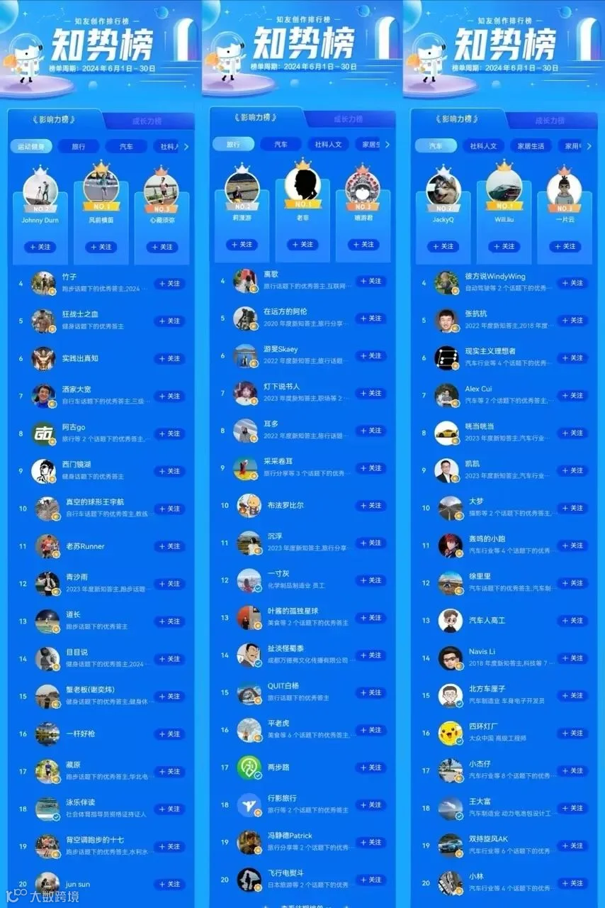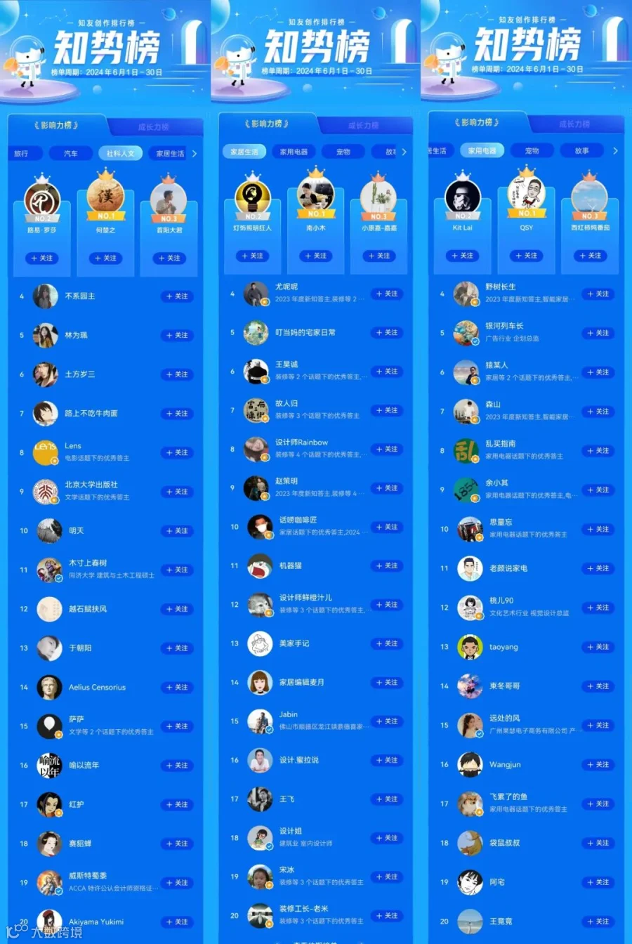 本期榜单统计周期为2024年6月1日至6月30日,全面展示各领域内容创作者的专业性与影响力,助力优质内容在平台内实现更广泛传播[k]。