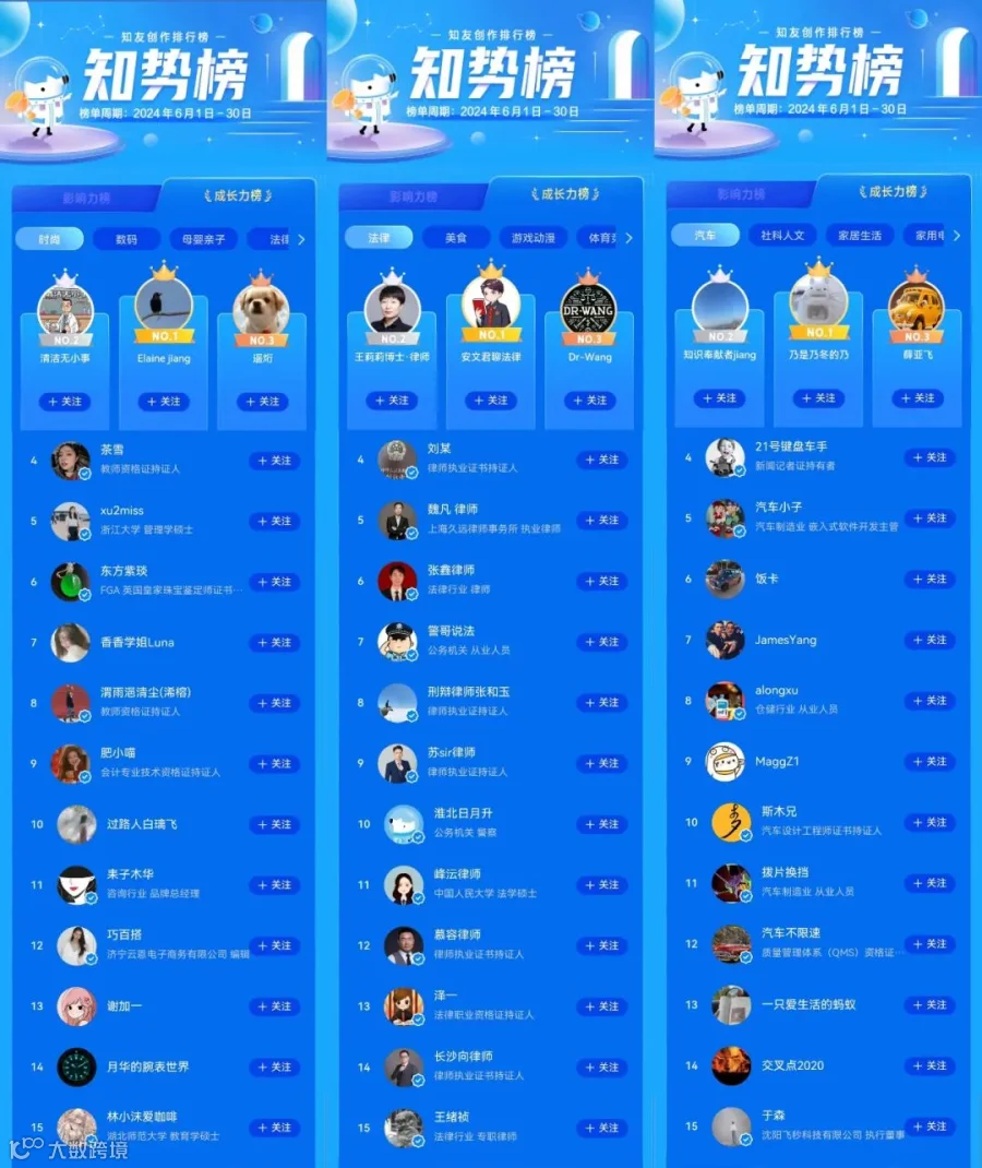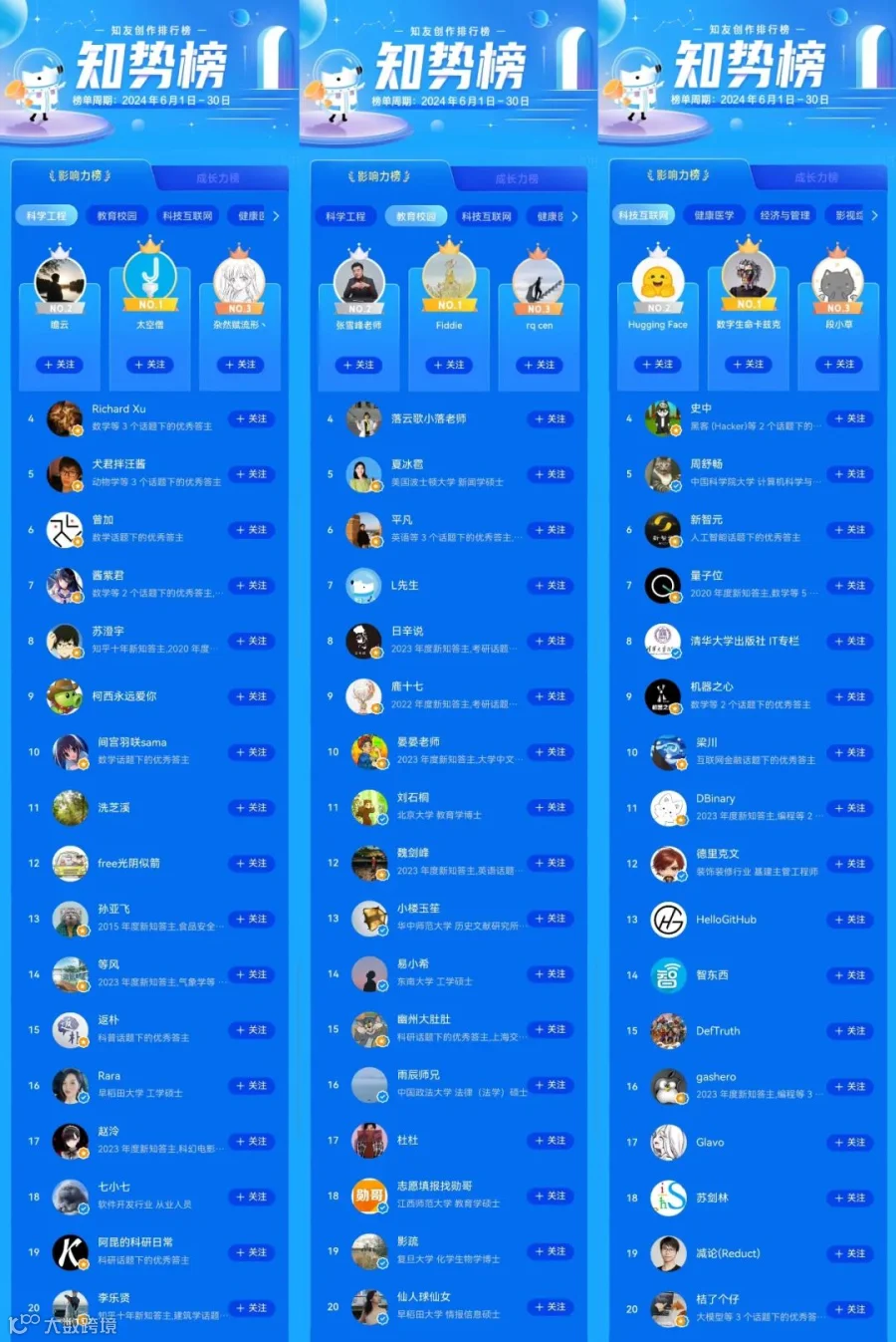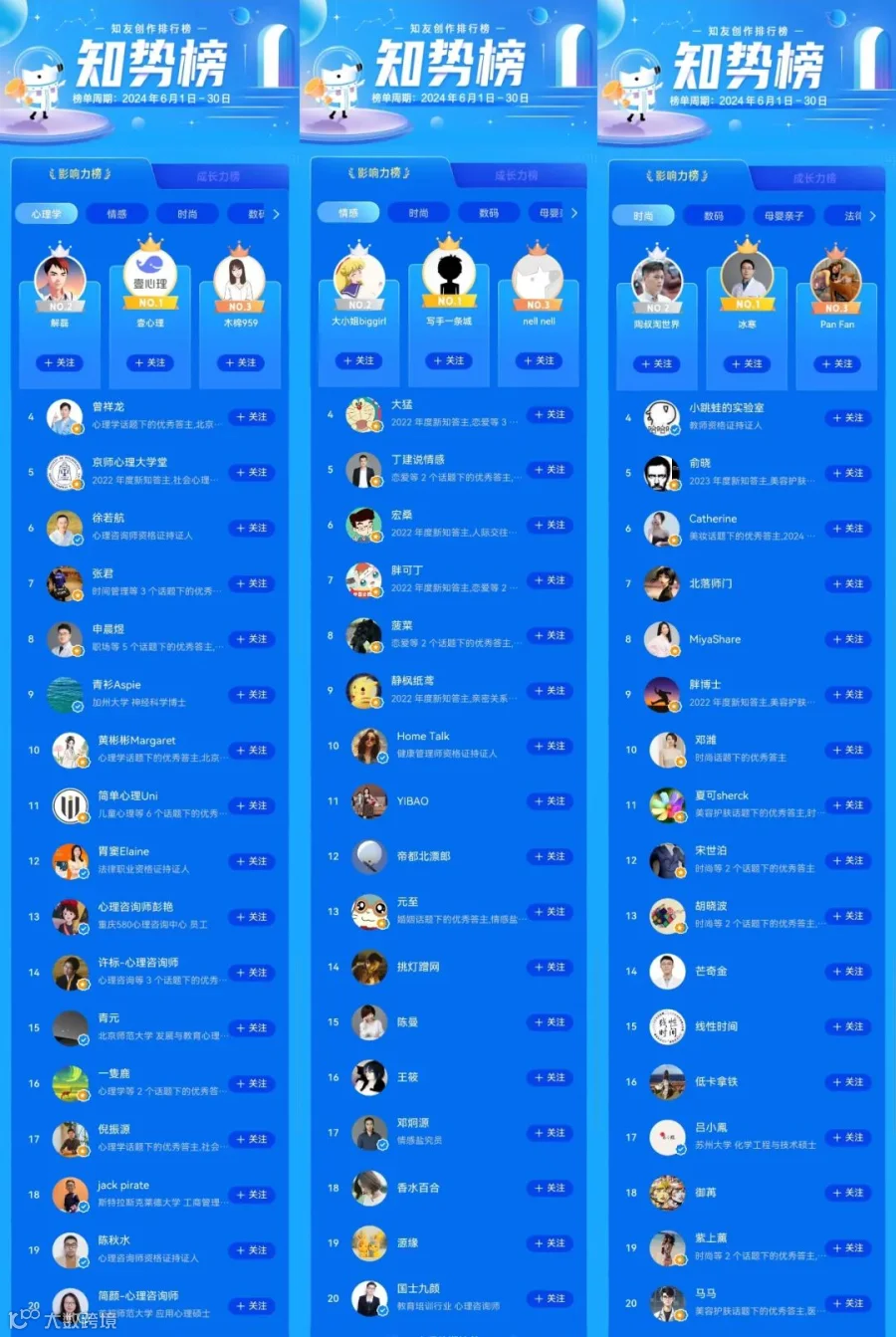 知乎「知势榜」于2024年6月如期公布,该榜单分为影响力榜与成长力榜两大类,旨在每月表彰在科学工程、教育校园、科技互联网、健康医学、经济与管理、影视综娱、职场、心理学、情感、时尚、数码、母婴亲子、法律、美食、游戏动漫、体育竞技、运动健身、旅行、汽车、社科人文、家居生活、家用电器、宠物、故事等24个领域中表现突出的答主[k]。