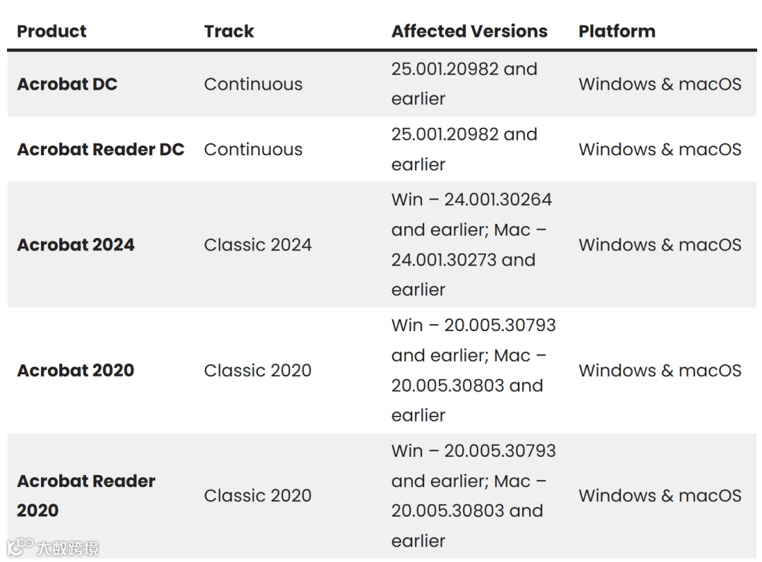 Adobe已推出修复版本:Acrobat DC/Reader DC更新至25.001.20997;Acrobat 2024更新至Windows 24.001.30307、macOS 24.001.30308;Acrobat 2020全平台更新至20.005.30838。