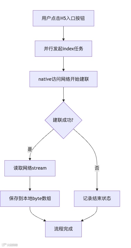 用户点击H5入口按钮,并行index任务发起,访问网络开始建联,一但完成有效建联,则保存网络stream对象,当webview需要使用该数据流的时候,判定stream对象是否存在,如果存在,则直接使用该数据流,如果stream对象不存在,则判定网络访问是否返回,如果是因为网络访问失败导致stream为空,则认为是并行任务失败,否则会进入等待模式,等待模式下,线程建立一个循环体,每隔5ms,探测一次stream是否存在,网络是否已完成建联,一但探测到结果,则退出循环体,即使多次没有探测到结果,1500ms后依然退出循环体,此时放弃并行任务数据,改为webview自主加载资源。