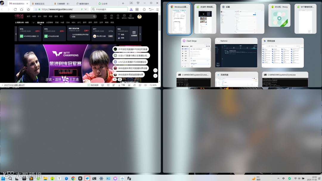 如果上下分屏需要大窗口工作,可使用 Win + Tab → 新建桌面,