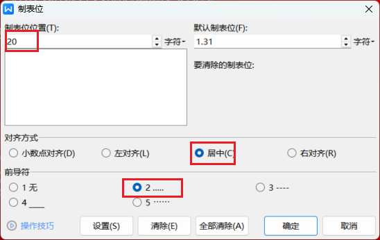 单击设置点击确定,这样就在文档的中间20个字符的位置设置了居中制表位