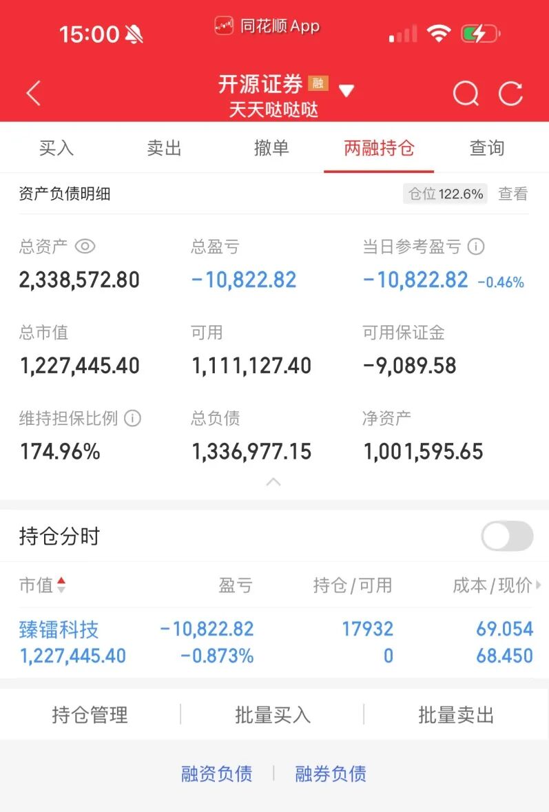 第二名雪雪娃,今天成绩微亏,总成绩144%。他连续两日空仓等节奏,今天终于再出发,满仓融资单吊商业航天:臻镭科技,今天该股低开高走,一度冲高至红盘9个点后回落,收盘上涨3%,他可能是下午尾盘低吸入场,收盘持有122万左右。