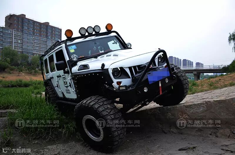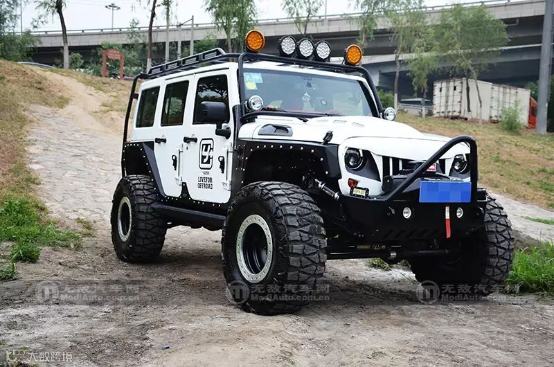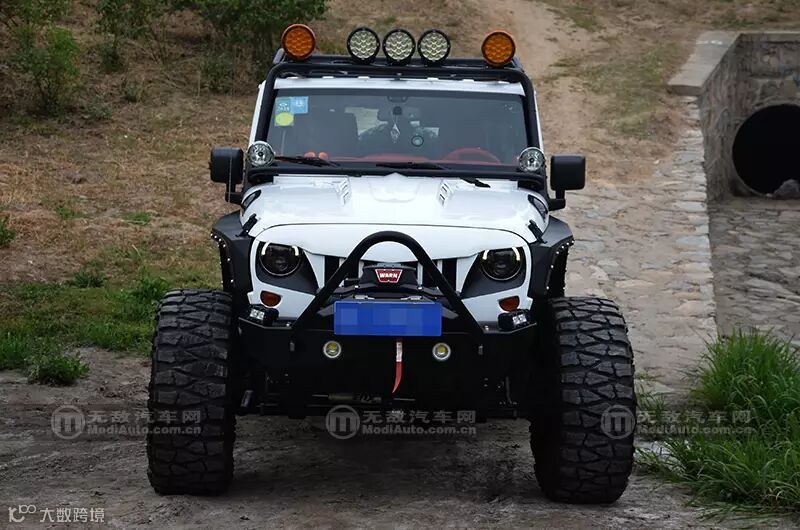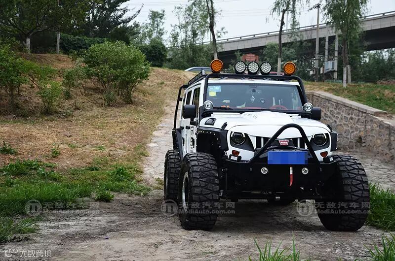 仔细看看身旁这个大家伙,它本质上是一辆大街上很常见的牧马人,但经过车主的改装使它变得那么不同寻常。很少见到一辆车气势如虹——最起码在我的认知中,它高的很离谱,并且这台车上的一切似乎都被放大了。其它日常常见的车跟它摆在一切,简直像是“没长开”一般,就如同郭敬明站在NBA球员身边,你懂的。我想说的是,无论把它摆在任何地方,它都是最吸睛的那个。