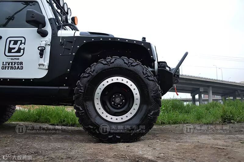 图:ATX超大负值的防脱圈轮毂+37寸的东洋龙爪轮胎是这台牧马人看上去异常凶悍的最大原因。看完这套轮圈在看看原厂的车轮,算了,还是不看了。