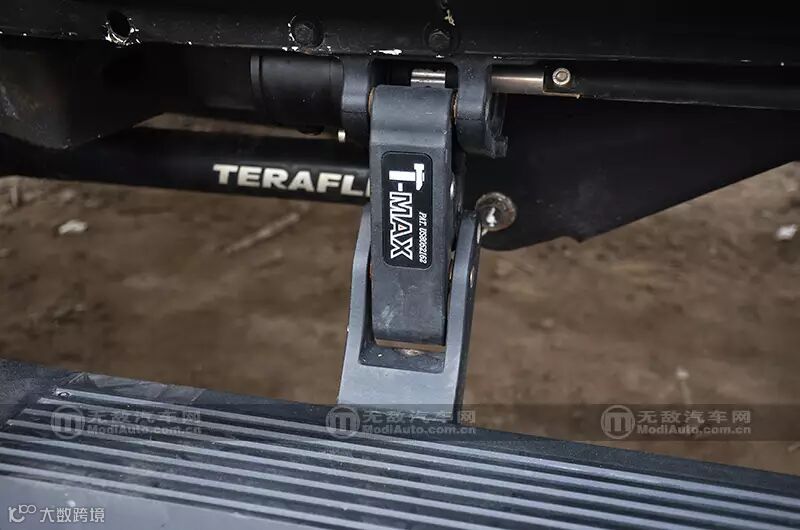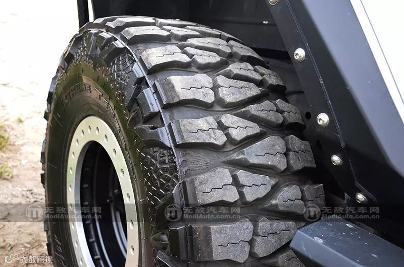 图:37寸东洋龙爪轮胎对于经常只能见到20寸以内的性能车车迷们来说,着实够唬人的。好吧,我想说我是被唬住的那一位。其胎纹有助于在附着力相对较差的路面上给予轮胎更强的抓地力。轮圈当然也是十分重要的,该车配备了ATX出品的超大负值防脱圈轮毂。超大负值的意义何在?自然是增大轮间距,让越野车的“下盘”更加稳定。