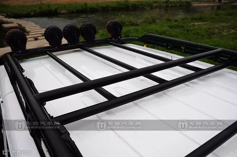 图:全车被外置的防滚架“包裹”。在一些很极限的情况下,越野车由于重心高,有可能出现翻车这样的事故。对于一般车辆而言,觉得翻车后车子一定就报废了,但由于专业的越野车开发用途不一样,修复后还是可以继续使用的。因此保护好车身会使修复工程变得更容易。忘记说了,还是MR(MARKROAD)出品。