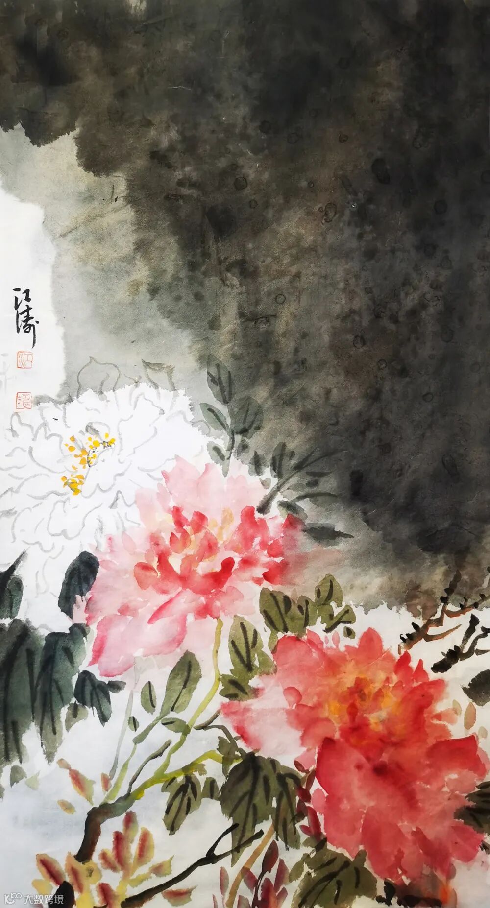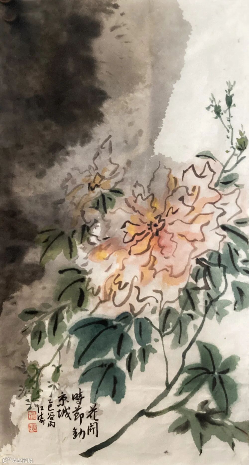 花鸟一道,江涛亦臻妙境。其不泥于形似,更求神似与意趣。所绘翎毛,或啄食栖枝,或振翅欲飞,姿态各异,栩栩如生;笔下花卉,或雍容盛放,或含苞待放,设色清丽,艳而不俗。他尤擅捕捉瞬间之态:春燕掠水,翅尖带露;夏荷凝香,蜻蜓点立;秋菊傲霜,蛱蝶翩跹;冬梅映雪,暗香浮动。每作一花一鸟,必细察其形、深悟其性,故能于笔墨间传递出生命之鲜活。笔者观其作,时时绘四时名花,穿插禽鸟虫鱼,笔墨精工而不失灵动,观之如入芳园,满目生机。
