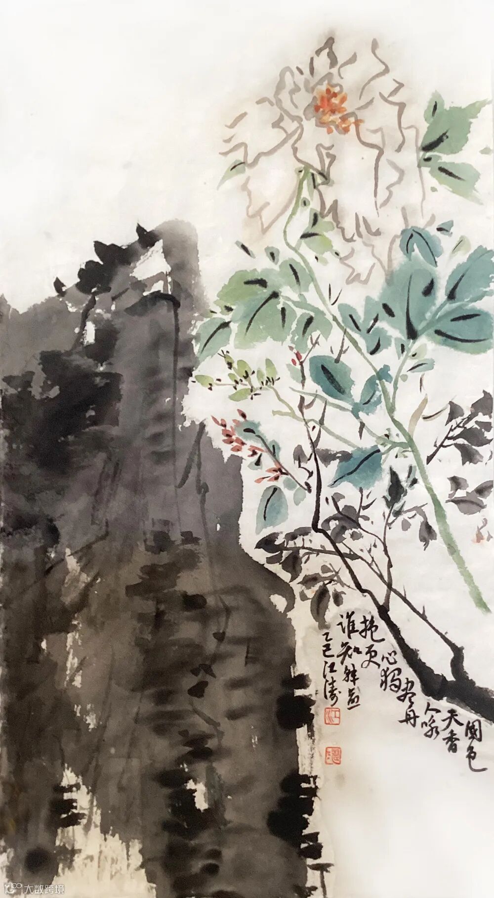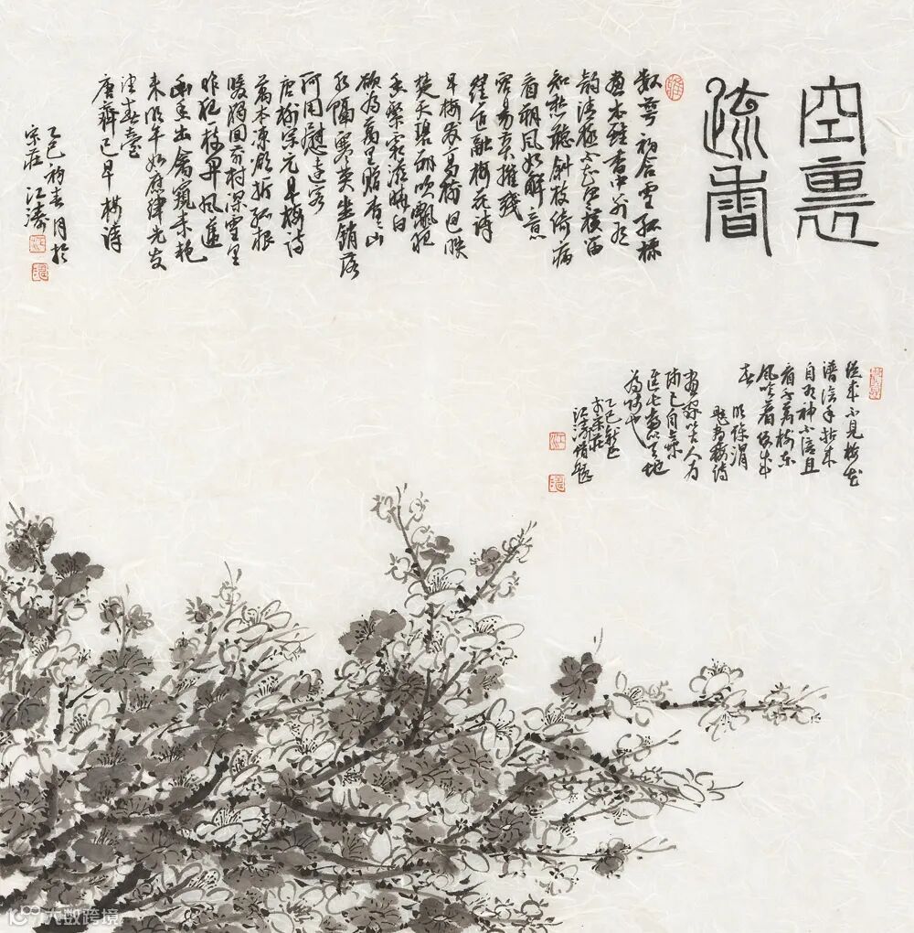 江涛自幼浸淫古籍,于《诗经》《楚辞》、诸子散文及唐宋诗文皆有深究。所作题跋,或咏景抒情,或谈艺论道,文辞简练而意蕴悠长,与画作相得益彰,追求文墨交融之妙。她常谓:“画为心迹,文为画魂。无文之画,徒有其形;无画之文,失其载体。”故其艺事,以文养画,以画辅文,二者浑然一体,自成高格。