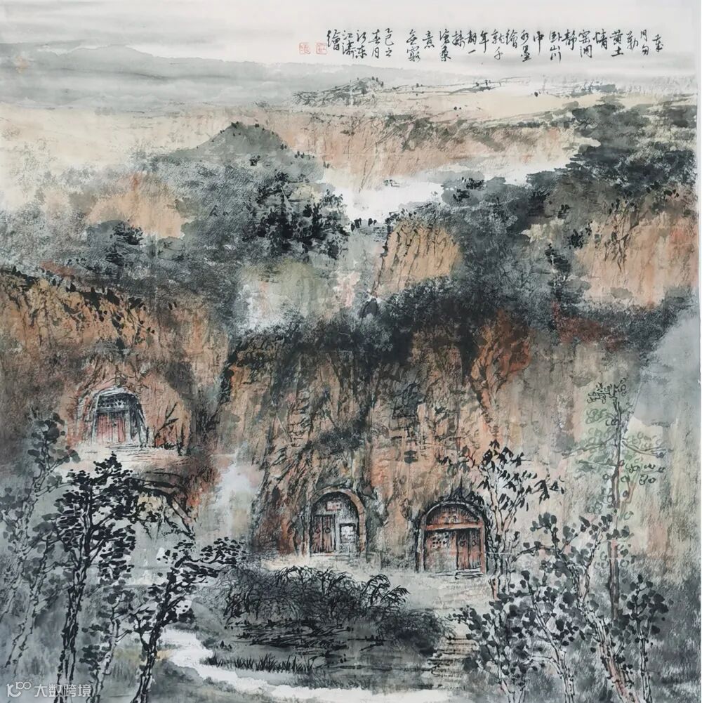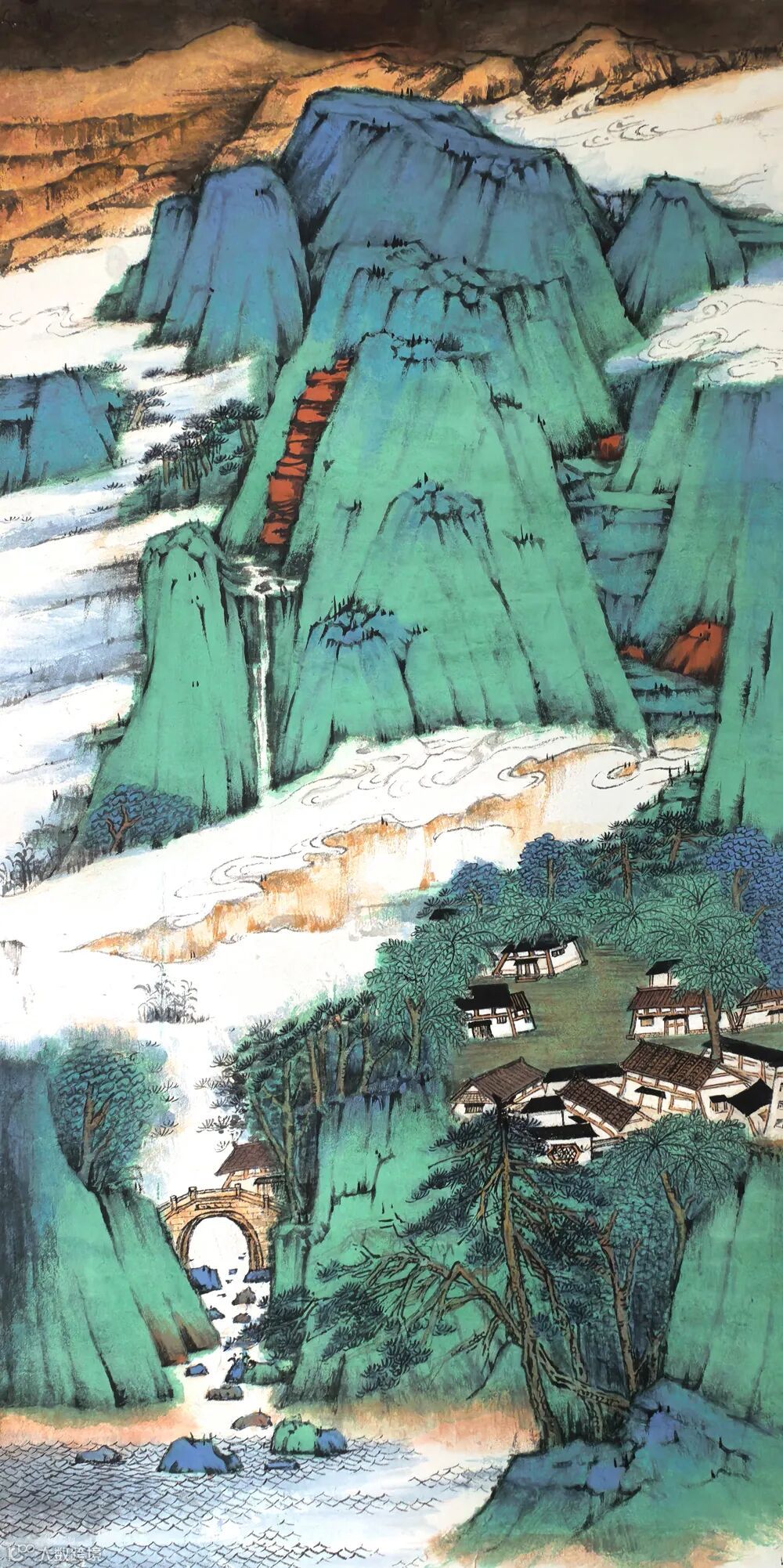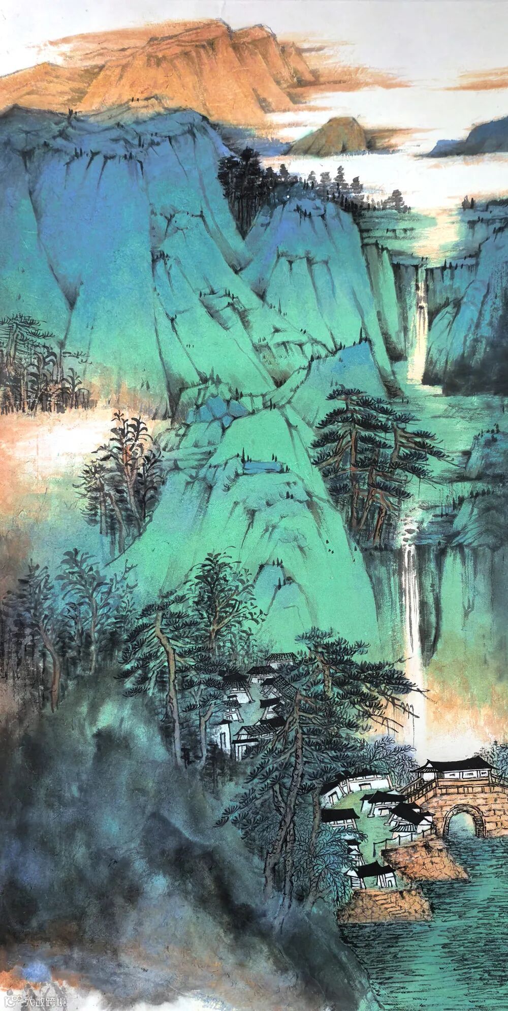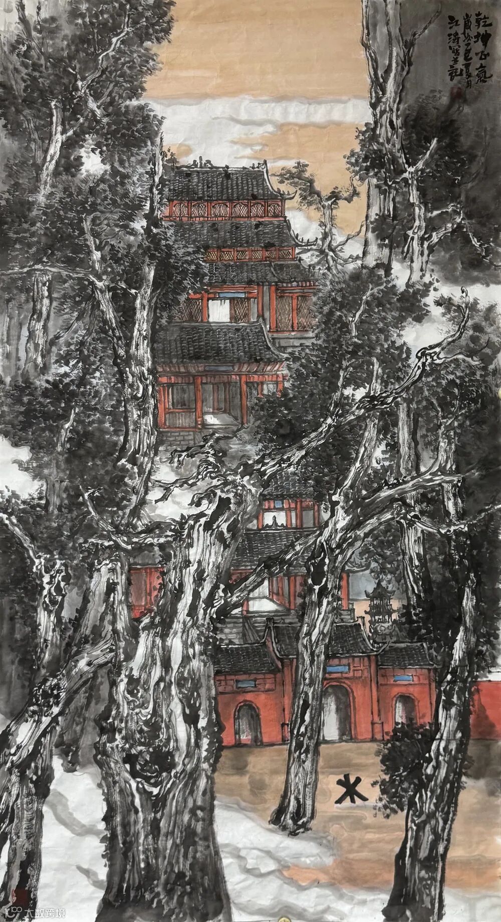 江涛画山水,师法宋元诸家,兼采明清笔墨之妙,更重师法自然。每遇名山大川,必携纸墨往,登峰峦而观云海,临溪涧而察流泉,于烟岚变幻、草木枯荣间体悟天地气机。其作多以全景式构图铺陈,峰峦叠嶂者,或雄奇险峻,或秀润空灵,皴擦点染皆合古法,而气韵自生。笔下云涛奔涌,似闻松涛阵阵;溪谷幽深,隐见茅舍疏篱,墨色浓淡相宜,干湿相生,于虚实之间见丘壑万千。观其重彩山水,见霜林尽染,石径蜿蜒,隐者策杖而行,意境清远,直追倪黄之雅韵,足见其对山水精神之深刻体悟。