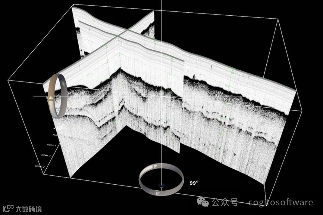 在 3D 查看器中可视化多条线路、DTM、声纳镶嵌图、xyz 振幅云和数字化特征,并分析交叉点