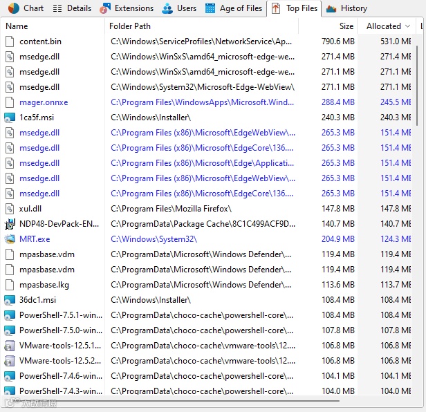 “大文件”视图列出了扫描分支中最大的文件。与“详细信息”视图类似,您可以通过列表的列标题配置此处显示的信息。请注意,系统目录“系统卷标信息(System Volume Information)”和“回收站”中的文件不会在此视图中列出。在“选项”对话框中,您可以调整列表中显示的文件数量,以及是根据文件的实际大小还是其在磁盘上占用的空间来排序。