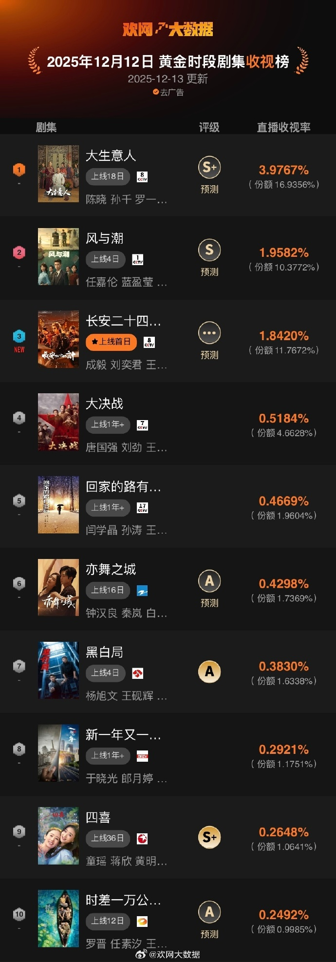 12月12日 欢网大数据【黄金时段】全部频道剧集直播收视率来啦!