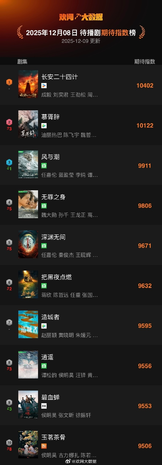 12月8日 欢网大数据【待播剧】期待指数 TOP10来了!