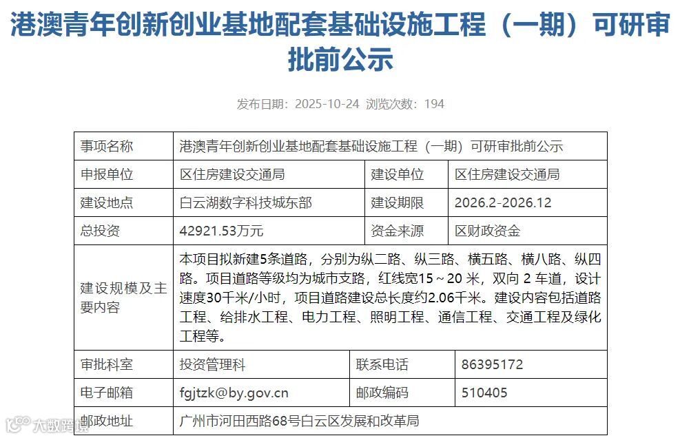 近期,区住房建设交通局正式对港澳青年创新创业基地配套基础设施工程(一期) 进行可行性研究报告审批前公示。这意味着,白云湖数字科技城东部区域的路网将迎来重要升级,为基地发展注入强劲动力。