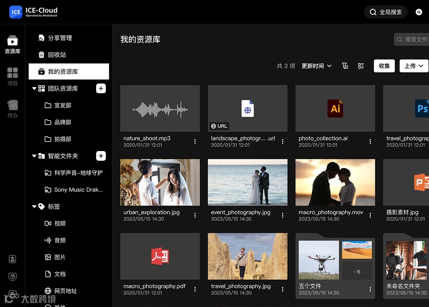 ICE-Cloud提供强大的个人资源库和统一的团队协作空间。支持包括音视频、图片、文档、设计文件在内的超200种文件格式和音视频编码,支持全局搜索和多维度筛选、并可进行多版本堆叠管理,确保各类资产有序存储,并可随时随地查找、调用和分享。