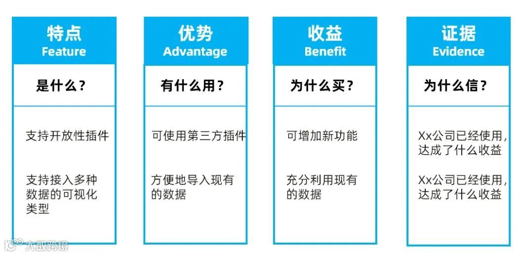 特点(feature)解决的是“它是什么”的问题,优点(Advantages)解决的是“它能做什么”的问题,而利益(Benefits)则是“你为什么需要它”。最后,证据(Evidence)是提供证据,证明刚才所说的是真的,“你为什么要相信我所说的”。