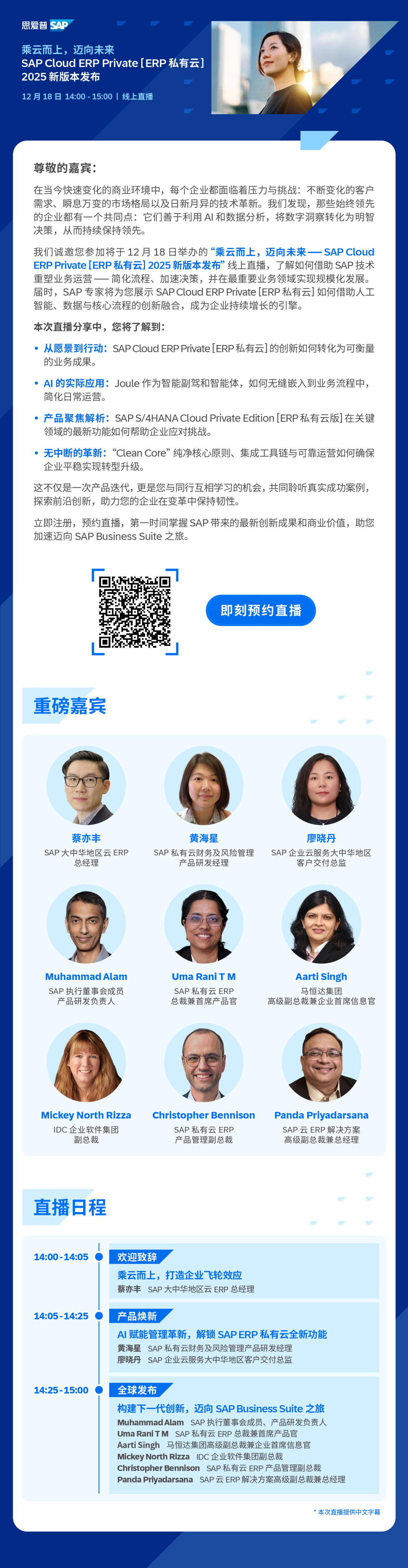 2025年10月,SAP 全球重磅发布了 SAP Cloud ERP Private [ERP 私有云]新版本,这不仅是一次产品迭代,更是以前沿 AI 与数据为核心驱动,助力企业全面提升敏捷性与应变能力,通过驾驭数据与人工智能,在变革时代保持强劲韧性。12月18日,《乘云而上,迈向未来——SAP Cloud ERP Private [ERP 私有云] 2025 新版本发布》线上直播即将开启,将为您展示 SAP Cloud ERP Private [ERP 私有云]如何借助人工智能、数据与核心流程的创新融合,成为企业持续增长的引擎。
