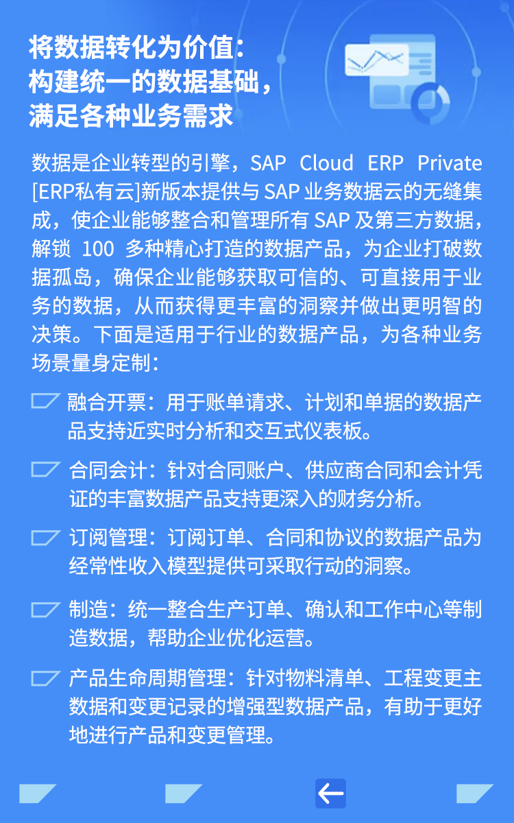 SAP Cloud ERP Private [ERP 私有云] 新版本在应用、数据与 AI 三大领域掀起新一轮创新浪潮,围绕生成式 AI 深度集成、全业务流程智能化升级、行业功能增强等核心领域推出系统性创新,帮助企业充分利用数据,获得实时洞察、简化流程并加速决策,构建持续创新的企业飞轮效应。