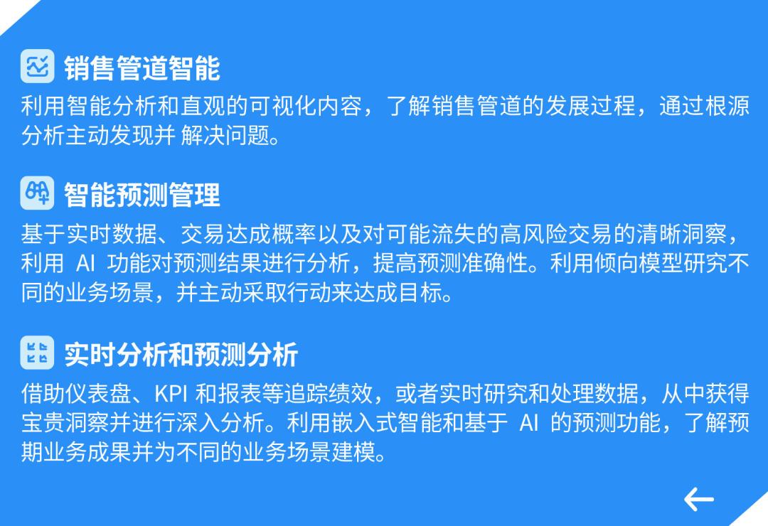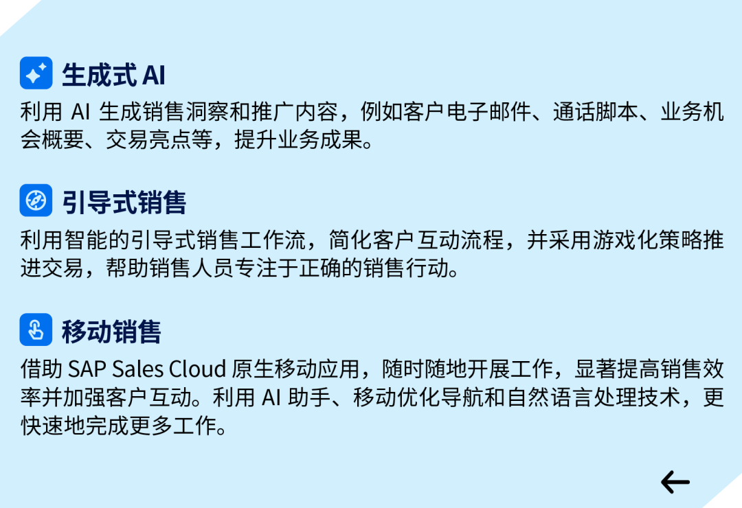SAP Sales Cloud 提供引导式销售、智能建议和生成式 AI 功能,可以向销售人员交付可据以采取行动的数据,通过为销售人员提供正确的需求信号、后续最佳行动建议和分析数据,帮助他们制定明智的销售决策,销售部门可以大规模提高他们的工作效率并加快交易速度,亦可提供量身定制的销售互动体验。