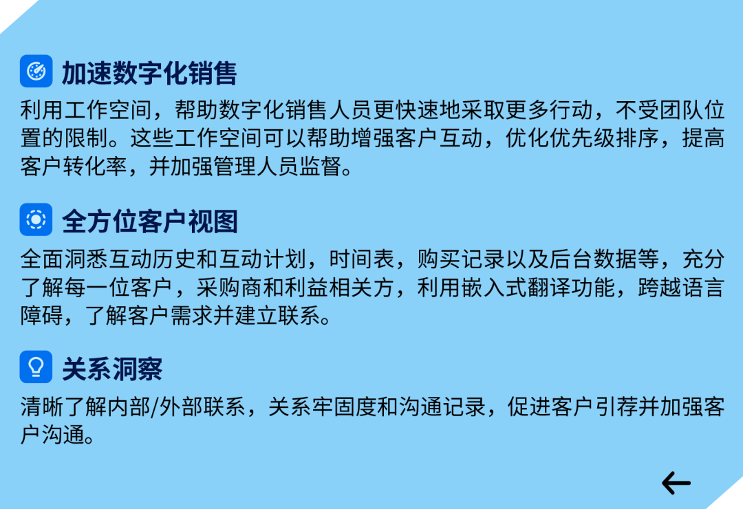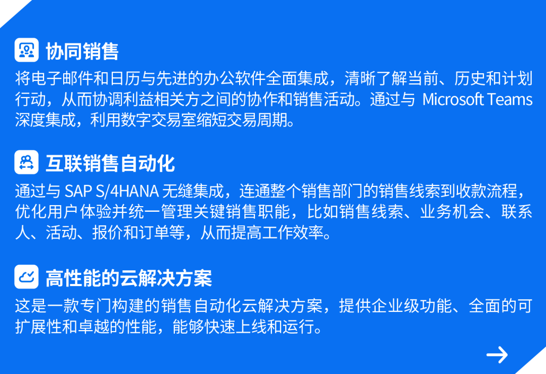借助 SAP Sales Cloud 解决方案,实现数据和销售线索到收款流程的全面互联,为销售人员提供无缝、智能的销售体验,进而提升业务成果;还能为销售人员提供富含洞察的信息和建议,在销售之旅的各个阶段提供业务情境并指明方向;高度灵活的销售流程,助力销售人员在不断变化的市场中满足复杂的客户要求,并发现新的业务机会。