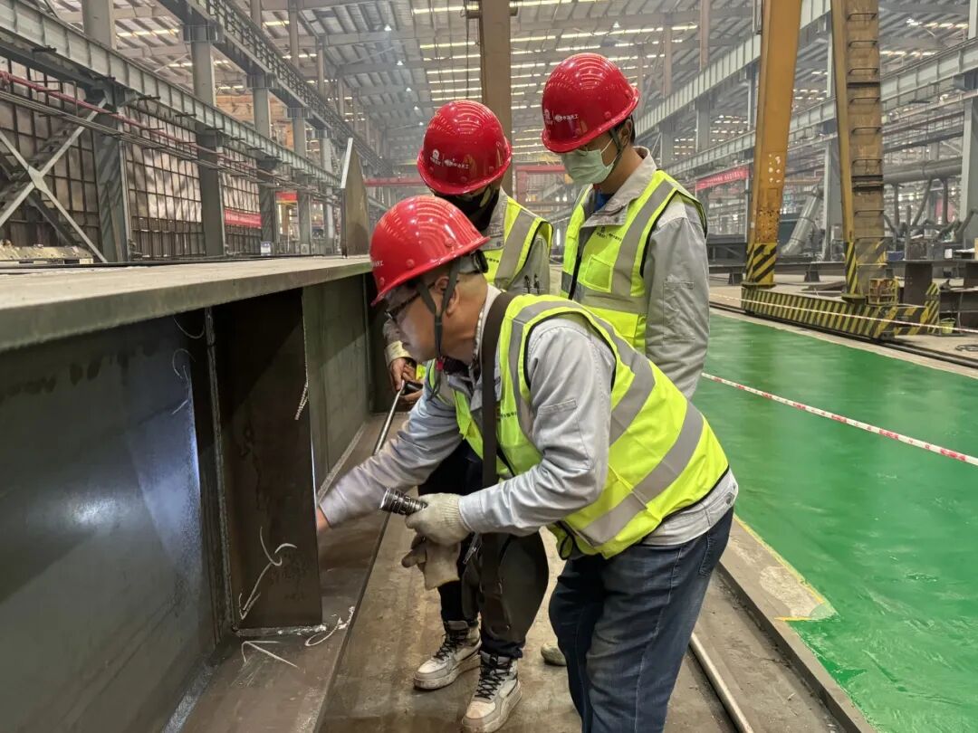 质量的精细管控,能够保证每个流程的紧密衔接,加快生产效率,项目施工过程中采取了一系列措施,促进提升产品质量。建立样板引路制度,根据项目工程概况、建筑结构特点及交付验收标准,严格执行样板引路制度,从切割下料到涂装施工,全过程按照不同施工工序制定施工样板,组织施工人员进行观察和学习。首件验收过程中,为防止构件出现批量性超差、返修、报废,项目团队联合相关方进行重要工序构件的首件验收,有效提升生产品质,确保整个工程的顺利进行。项目团队积极开展以“查质量意识、查质量水平、查保证体系、查标准执行情况、查计量检测保证、查现场管理、查质量缺陷”为主要内容的“七查”活动,通过专项检查、综合检查以及巡检等形式,促使构件实体质量有效提升。