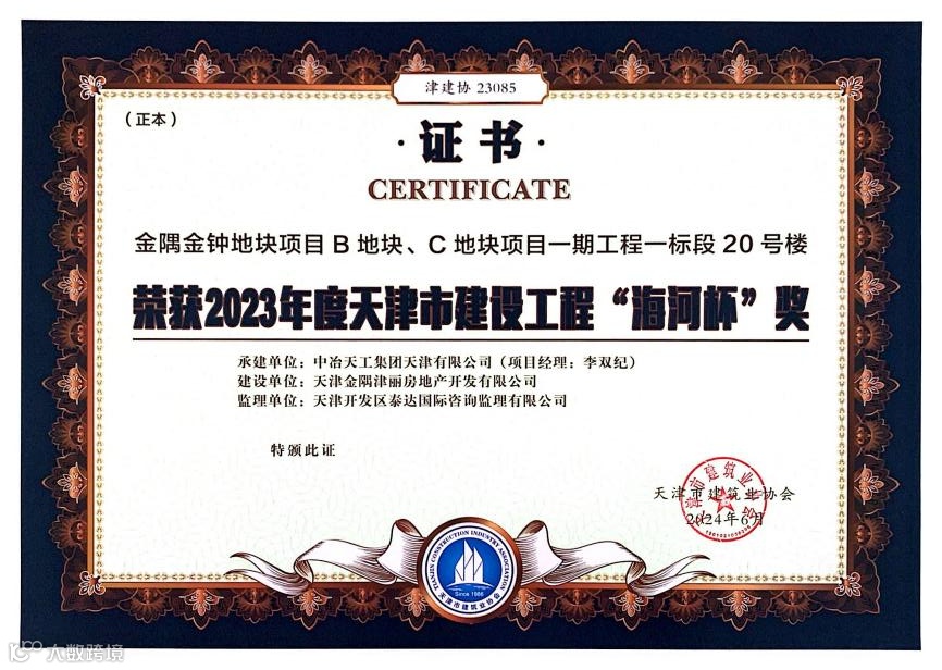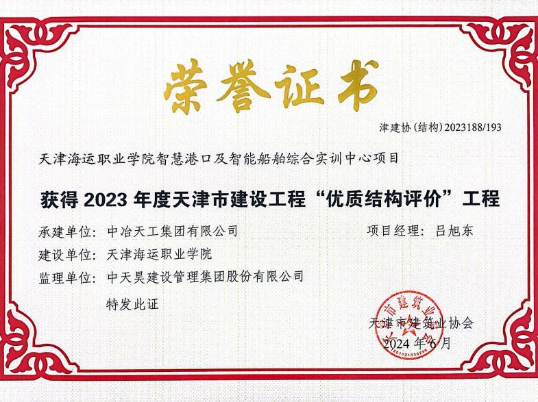 8月23日,天津市建筑业协会下发2023年度天津市建设工程“优质结构评价”及天津市建设工程“海河杯”奖证书及奖杯,在中冶天工各级管理团队的共同努力下,共取得8项“优质结构评价”及3项“海河杯”奖。此外,天津市建筑业协会授予中冶天工“创建‘海河杯’优质工程先进单位”荣誉,这是社会各界对“天工质量”的认可,激励天工人继续精益求精、追求卓越、打造精品。