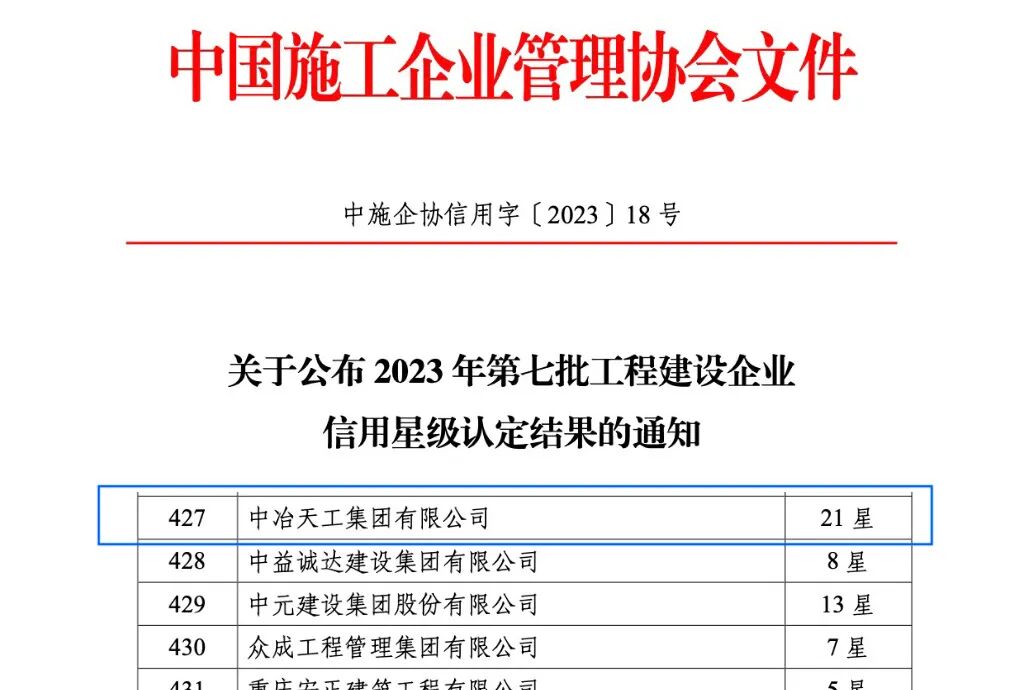 近日,中国施工企业管理协会、商业信用中心公布了2023年度工程建设诚信典型企业、工程建设企业信用星级认定、第四届优秀诚信企业案例等表彰结果。