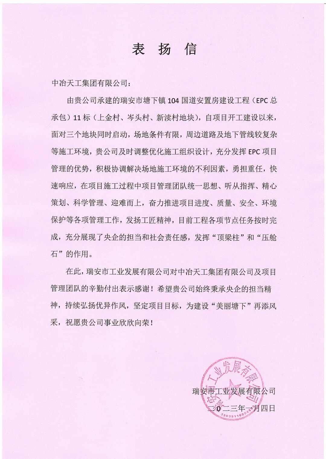 项目部收到瑞安市工业发展有限公司致集团公司表扬信,对项目部统筹规划、合理布局、大力协调资源、积极解决难题、有序组织施工,顺利完成各项工程节点和任务目标表示高度认可。