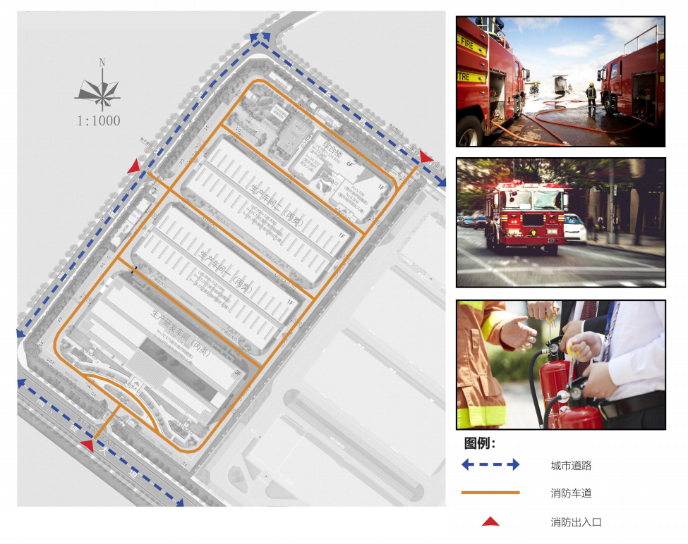 创造人车分流的道路交通组织,同时协调机动车、人行两种交通方式的关系,依据园区工作人员出入方向及外围城市道路状况,将出入口设置于西北侧、东侧及南侧,厂区通过周边式环状道路和步行道路有效地将汽车交通和步行交通结合,园区车行系统兼备消防通道功能,使消防车能够方便到达每一栋建筑。