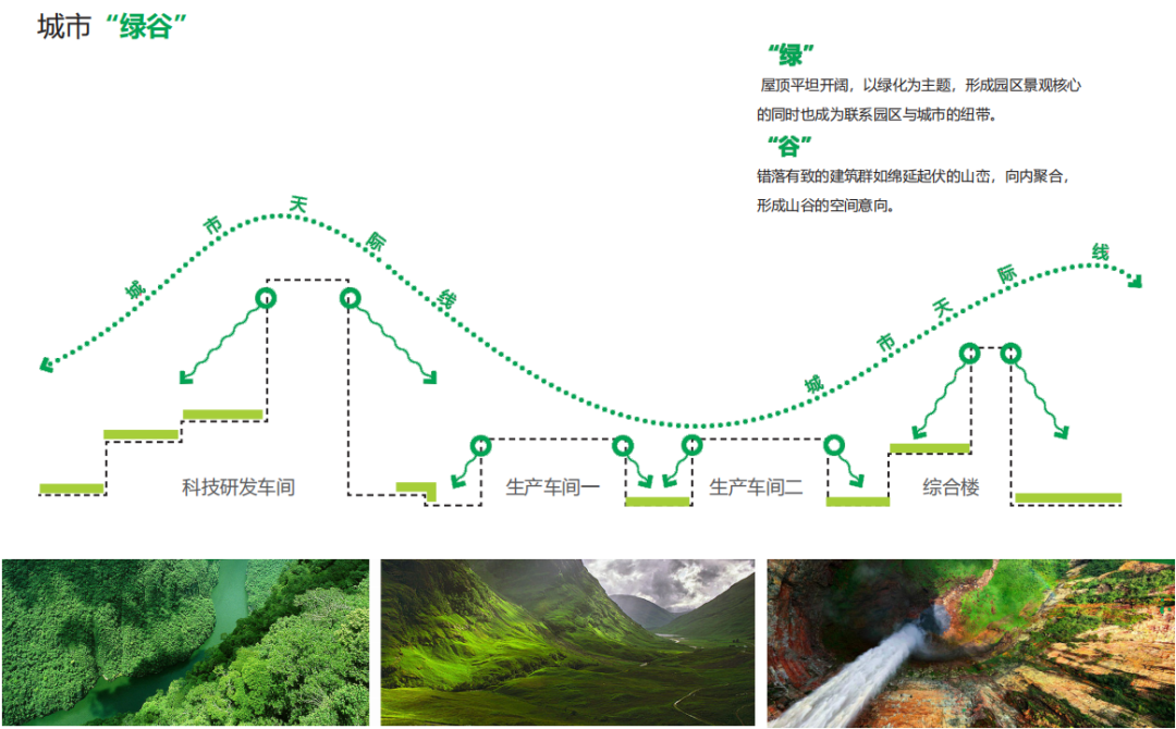 设计方案为城市打造“生态绿谷”,错落有致的建筑布局如绵延起伏的山峦,内向聚合,形成山谷空间意向,通过景观绿化作为联系园区与城市的纽带,塑造人、空间、环境共生的健康生产方式,打造游离于城市之上的都市绿洲。