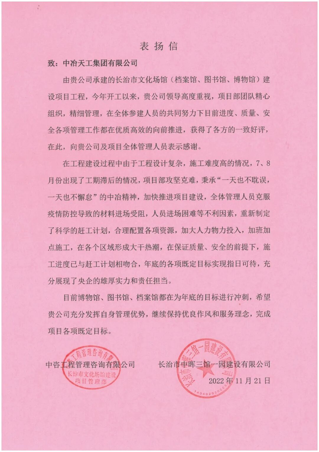 项目全体员工将继续保持奋进之心,以昂扬的斗志把项目做大做优做精,实干为先,主动作为,大力弘扬劳模精神、工匠精神,将长治文化场馆项目打造成“精品工程”,成为屹立在上党区广袤沃土的“天工名片”。