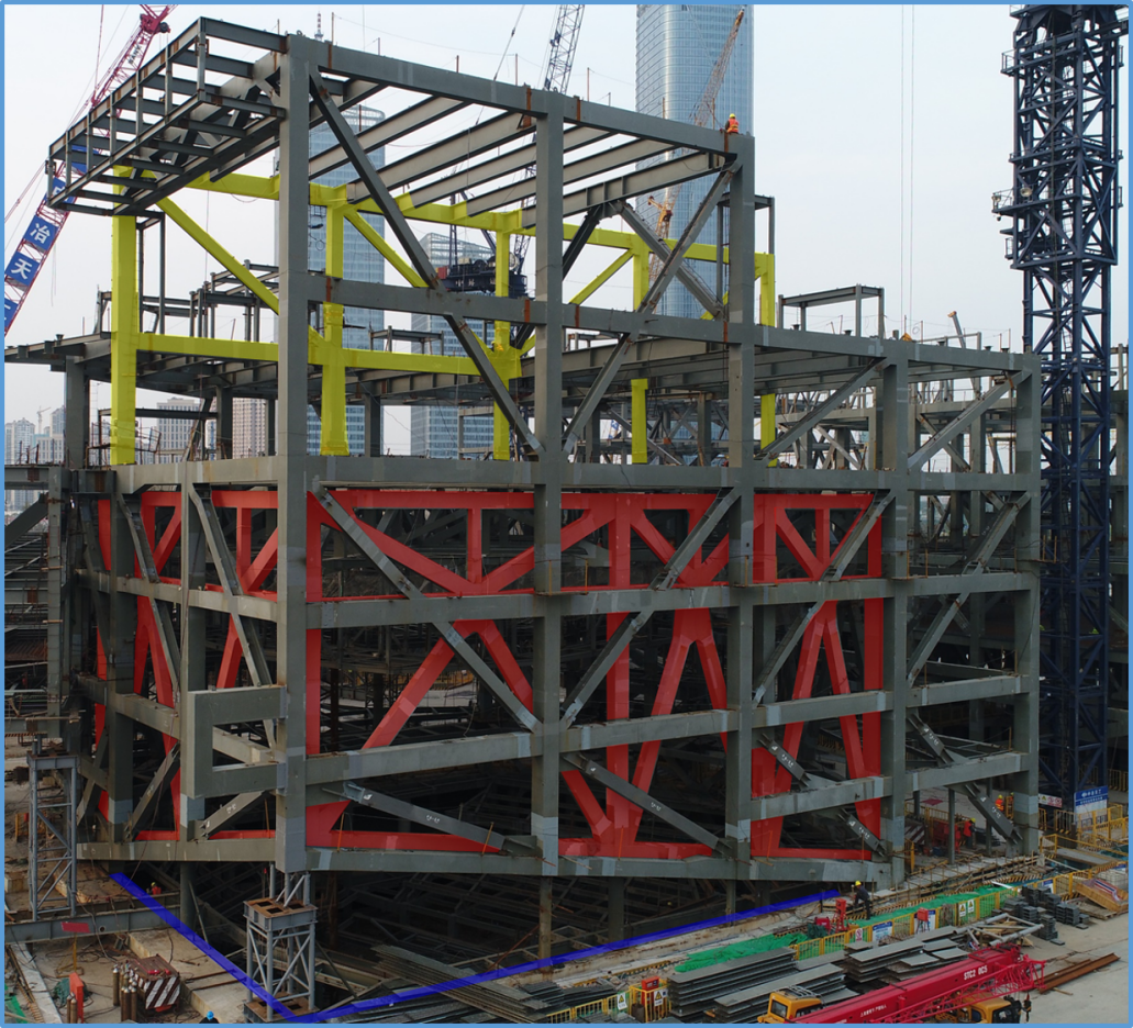 施工过程中,通过对房中房下部构造缝边缘钢柱开设双焊接作业孔,解决焊接型柱脚定位难问题;通过软碰撞检查,调整内外框构件的安装顺序,使受影响接口数量达到最小,解决内外框焊接相互影响的问题;实施内外框悬挑平台主梁组合吊装,提高双悬挑平台安装精度;采用短管支撑+内房桁架+格构式支撑+路基板的组合支撑方式,解决跨房中房超重桁架与内房结构距离小、下部隔振器承载能力有限的难题。