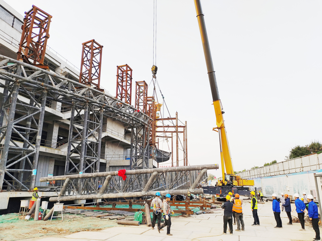 10月8日,项目图书馆/档案馆工程,第一组屋面桁架顺利吊装完成,标志着钢结构吊装作业进入施工快车道,“书页”外型的钢结构已翻开崭新的一页。