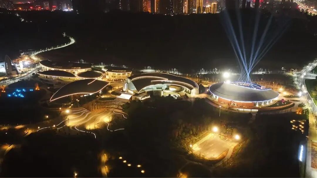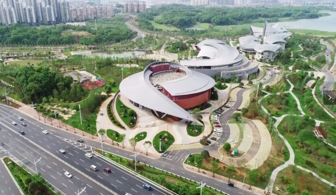 项目由中国工程院院士崔愷大师率领一流设计团队打造,秉承本土化、生态化设计理念,以“洞庭渔歌”为主题,巧用“借势”“接地”“联通”“回溯”等设计手法,沿山脊呈线性分布,延续梓山湖南岸的山水脉络,连续游览于路径、山顶、景观、步道、回廊、山林及水溪之中,俯瞰全景,形态各异的银灰色金属屋面辗转起伏,绵延相连,仿佛鱼群欢呼雀跃,奔向湖面,彰显“洞庭渔歌”的湖区传统文化,凸显益阳“鱼米之乡”的吉祥寓意。项目设计延展出“以人为本,服务大众”的渔夫(服务、配套)、“承载文化,沉淀发展”的渔舟(文化、历史、规划)、“关爱人民,欢歌笑语”的渔歌(活动、愉悦)、“知识起源,开创未来”的渔火(知识、畅想),极大地丰富了益阳市民的精神文化生活,以湖畔点点渔火寄托中华民族永不褪色的华夏梦,薪火相传,生生不息。