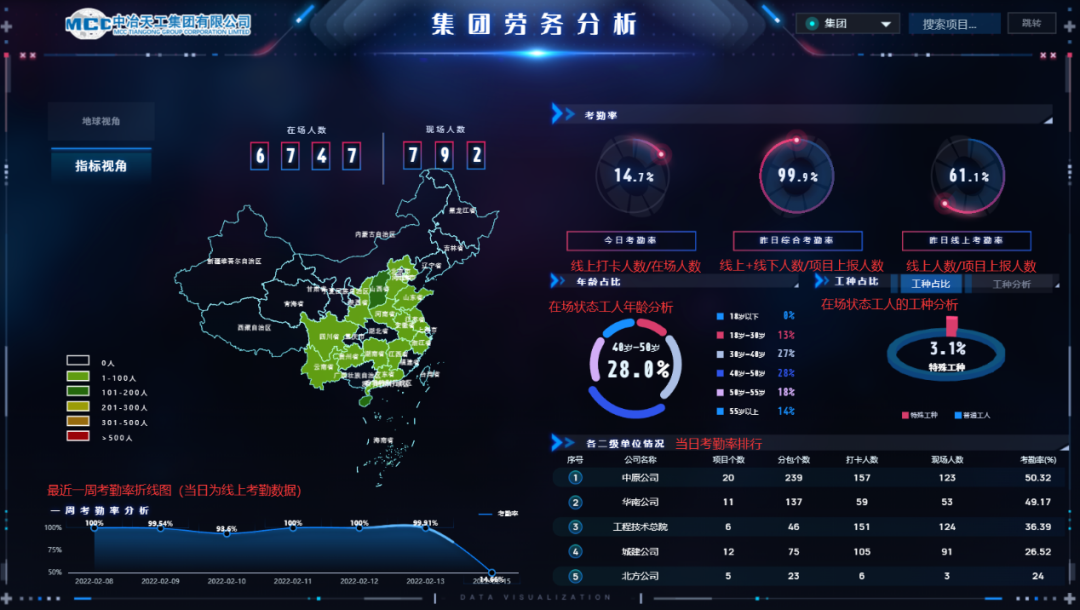 工程技术总院信息化中心深入贯彻集团公司“两会”精神,认真践行“数字五矿”理念,以数字化转型打造“智慧天工”。牢固树立“不为不办找理由、只为办好想办法”的服务意识,加快板块联动推动产业升级。全力建好“大后台”,为“小前端”的高效运行做好服务,实现集团公司劳务分析平台跃升2.0。以“地球视角”呈现全局劳务热力,用“指标视角”展现项目风采,依托“六个100%”促进项目自查。进一步推动集团公司点对点“穿透+督导”管理机制,实现项目管理内视。
