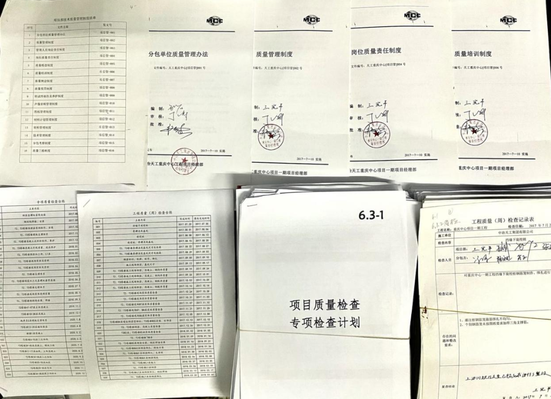 重庆中心是重庆市重点项目,也是参建各方单位的重点项目,在生产、质量、安全方面,地方主管部门每月检查、业主单位月度评估打分排名、公司“穿透+督导”、飞检、专项检。对此,项目团队不断强化品质意识,将管理工作提前,开展深化设计、工前培训、交底等,每道工序挂牌验收,按照岗位职责、方案、规范,抓细过程质量,锤炼精细严谨的工作作风,不断开展质量培训、监督、提升活动,从严质量管控,从严质量监督,从严质量考核。