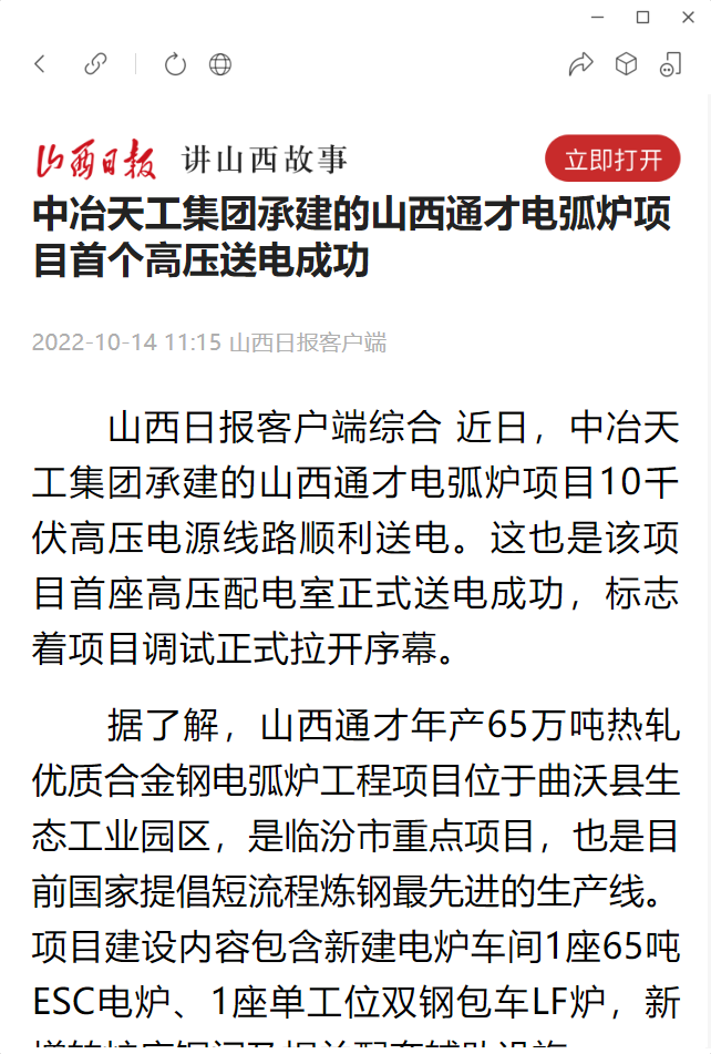 10月14日,《山西日报》客户端报道工业工程公司山西通才电弧炉项目团队克服诸多困难,放弃休假、不等不靠,实现该项目首座高压配电室送电圆满成功,为项目后续设备安装、管道敷设、设备调试等工序施工用电提供了重要的电能保障。