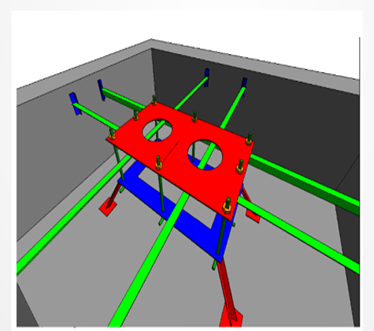 劲钢结构梁柱节点钢筋连接。劲钢结构梁柱节点钢筋比较复杂,尤其地库区域,最多处一根柱有六根梁与其连接。由于钢柱的影响,大部分梁筋无法通过,如何解决节点钢筋的连接、排布将是控制重点及难点。通过BIM技术对梁柱节点提前进行深化,提前排布好各层钢筋位置及连接方式,在钢柱深化时深化出钢托板及套筒,对钢筋锚固不满足要求的梁筋,第一排钢筋与钢托板焊接,二排采用套筒进行连接。