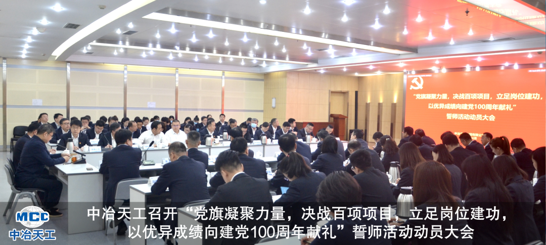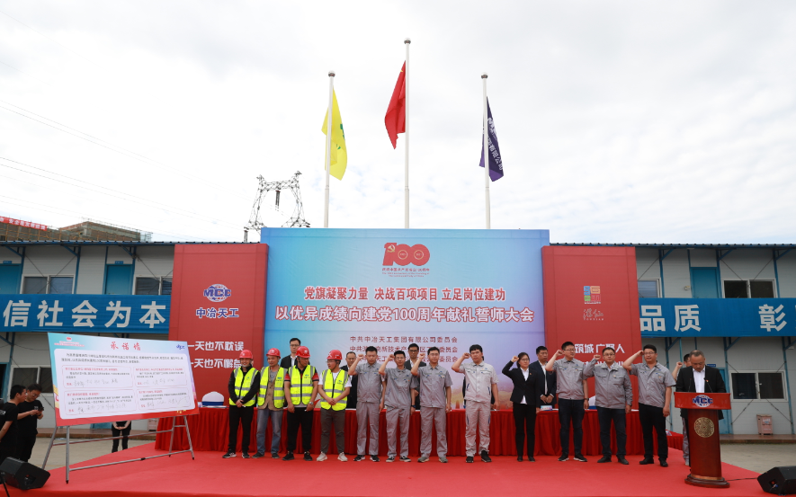 为高质量高标准推进党史学习教育,全面落实集团公司“项目管理经营能力建设年”各项部署安排,以新理念、新思想、新要求为引领,以打造项目“造血机器”为根本出发点和落脚点,4月27日中冶天工交通市政公司在富有西部“硅谷”之称的绵阳五里梁科技创新孵化园项目举办了“党旗凝聚力量、决战百项项目、立足岗位建功,以优异成绩向建党100周年献礼”誓师大会。大会以党建为引领,深入推动地方政府与企业党建共建,互通有无、互利共赢;以工期创效为抓手,整合倒逼调动各方资源,出精品、出效益;大力弘扬“战马精神”、“三牛精神”、“争创一流”精神,引导党员干部从中国共产党“百年辉煌”中汲取奋进新征程的力量、鼓足迎接新挑战的勇气、砥砺奋勇当先的信心和决心,打造项目“造血机器”,擦亮“天工质造”品牌,以强有力的行动力和优异成绩向建党100周年献礼!