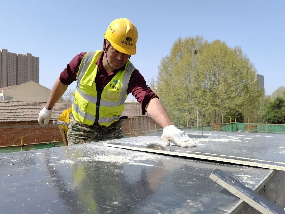另一个班组的钢筋绑扎工正在紧张有序的对七中小学部2号楼地块进行钢筋绑扎,干劲十足。小学部三号楼工作平台上,一位木工正按所需要的尺寸加工模板,模板加工完毕即可进行模板的搭建。