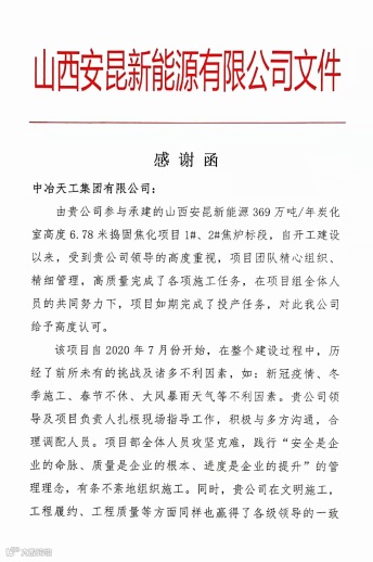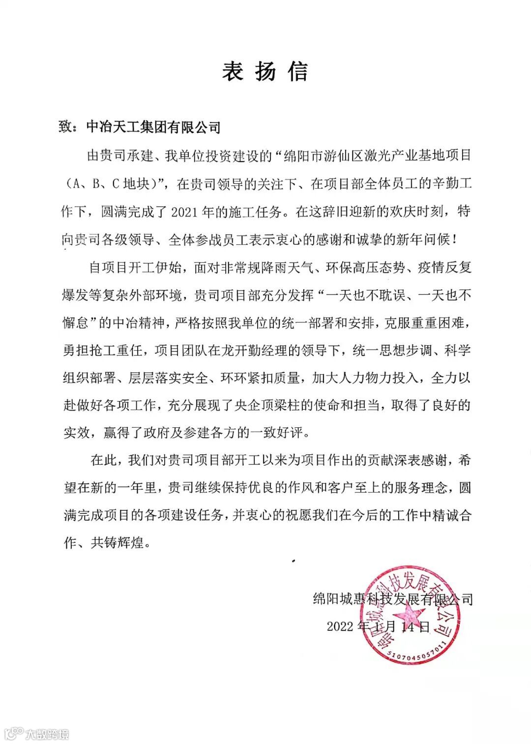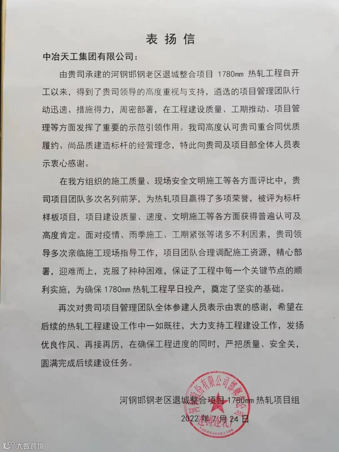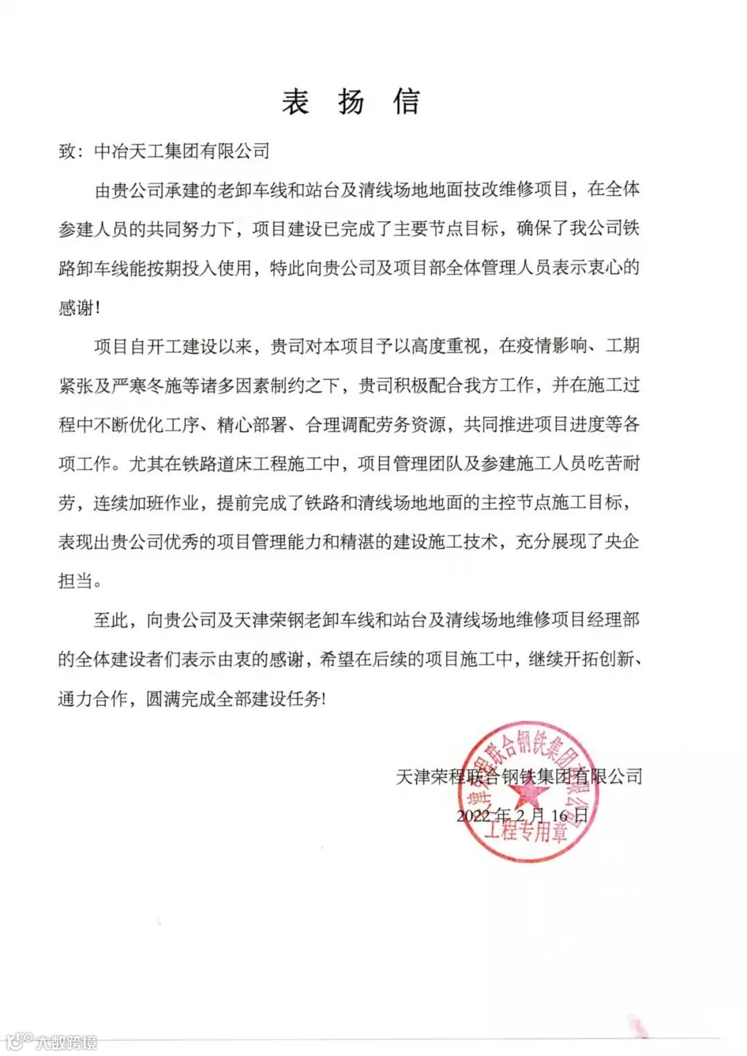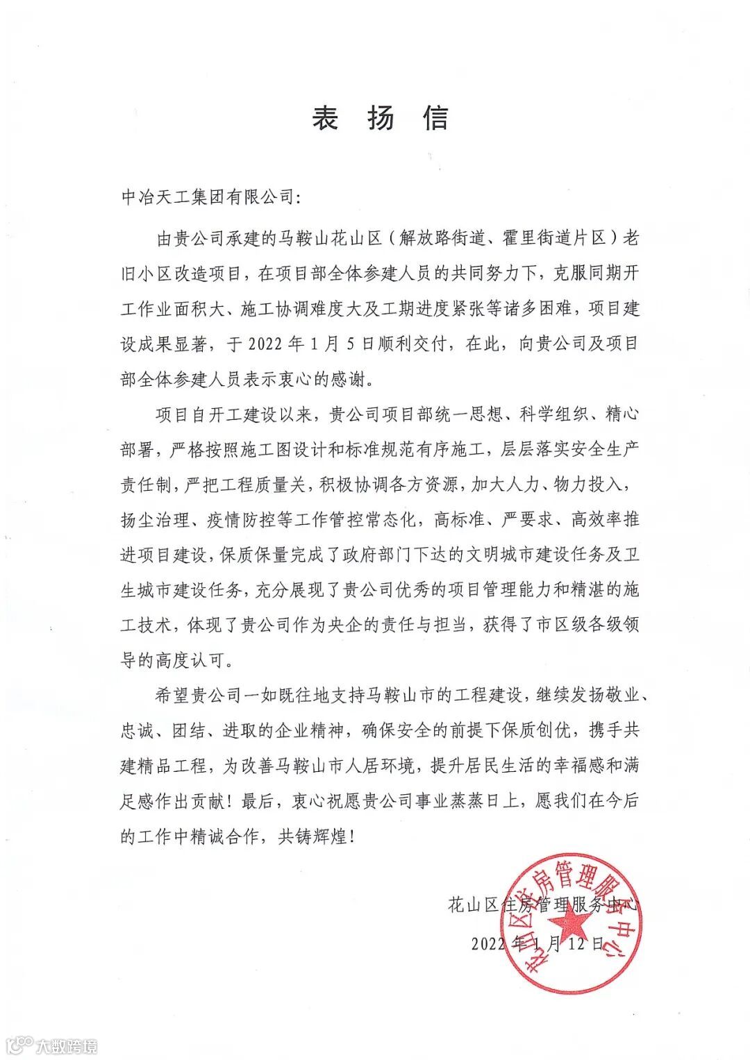 2022年开工至今,集团公司上下团结一心,攻坚克难,积极推动项目建设,全力推进全年指标,取得了一个又一个耀眼的佳绩,施工中我们力拔头筹,社会上我们勇于担当,抢险救灾、疫情援建、捐献公益等等领域都有着天工人的身影,中冶天工获得了社会各界的认可,至今,共收获表扬信、锦旗、荣誉证书等90余件,平均每月就有9份送到天工人的手上,这是对天工人匠心品质强有力的认证。