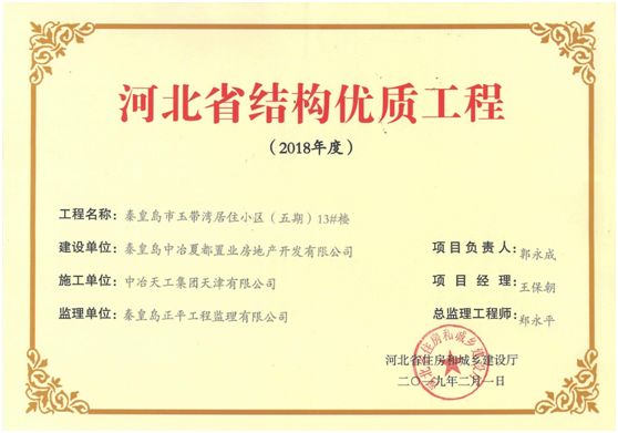 近日,二分公司承建的玉带湾项目再添殊荣,其五期13#楼工程凭借优质的施工质量和精工品质,顺利荣获“2018年度河北省优质结构工程”奖。