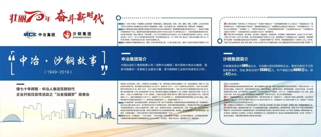 二十五载沙钢建设,中冶人初心如磐、使命在肩。在沙钢故事会现场,中冶建研院、中冶京诚、中冶南方、中冶焦耐、中冶华天、中冶北方、中国一冶、中国五冶、中冶天工、上海宝冶、中国二十冶等11家参与沙钢建设的中冶子企业,紧紧围绕“不忘初心、牢记使命”主题教育活动,以别开生面的故事会讲述方式,精彩生动、声情并茂地讲述了三代中冶人苦干实干、拼搏进取,攻克道道难关,“一天也不耽误,一天也不懈怠”,助力沙钢一举跨入世界500强企业的真情感人故事。故事会以热烈欢庆的舞蹈《花开盛世》隆重开场,中间穿插了反映中冶人扎根沙钢团结奋战的舞蹈《咱们工人有力量》,最后由沙钢集团、中国二十冶员工共同联手演绎的精彩大合唱《我和我的祖国》,使整场故事会达到了高潮,全面展示了中冶集团作为“冶金建设国家队”的责任、使命与担当。