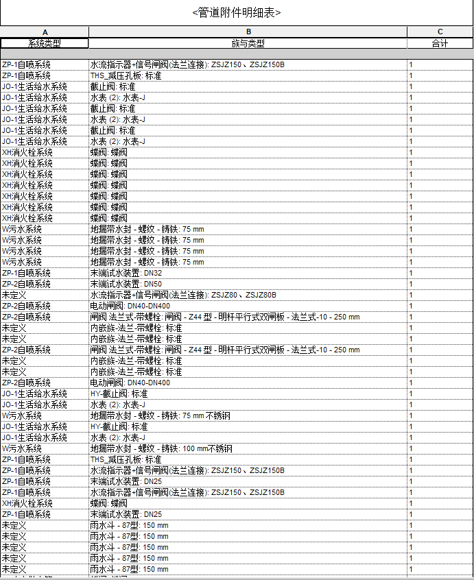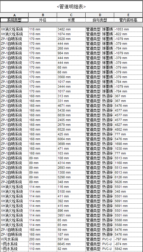 管线模型经过前期的规划调整,已经具备指导施工的作用,BIM模型的作用除了出具深化图、预留洞口定位、表达整体管线布局、传达各种信息等作用外,最重要的作用是物料工程量统计,模型的精细度直接关系到物料统计的准确性,精度越高统计越准确,反之亦然。而模型出具的是未含损耗的净量,且统计表中每一条目与模型中的族都存在对应关系,随着模型的调整变化,相应的统计表也随着发生变化,所建即所得。准确的工程量统计,避免一些不必要的材料浪费,相比手工统计降低了错误率,提高了工作效率。